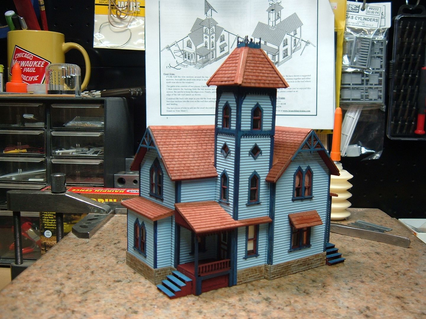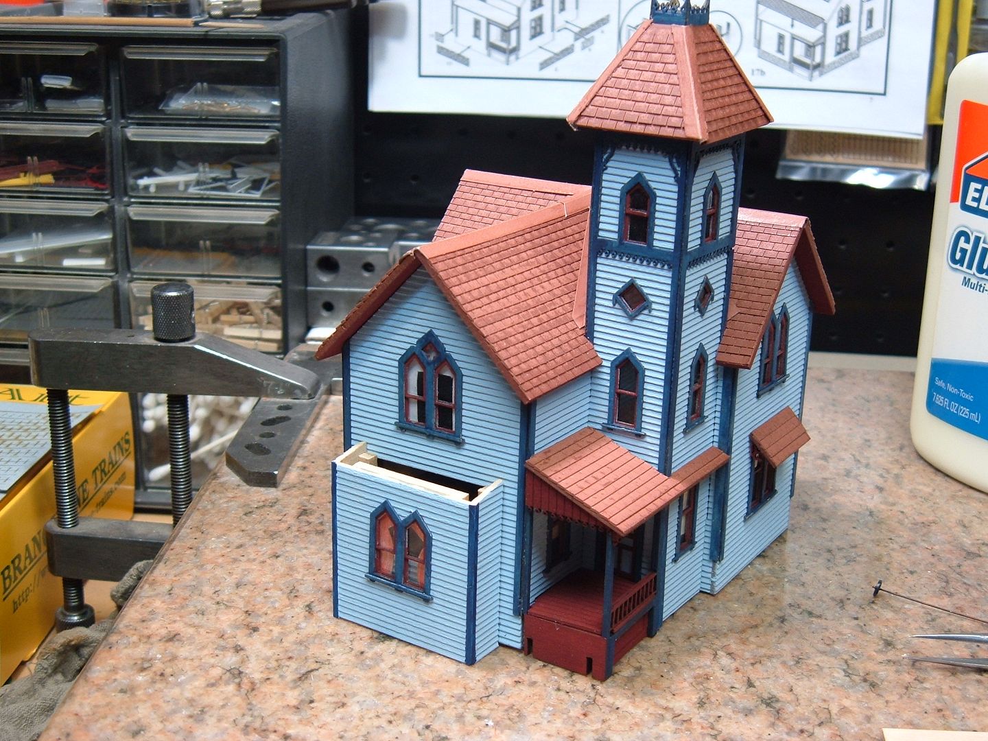 The front bay is attached and the tower roof is finished. The original bay window that came with the kit had angled walls, I just built mine straight. Also the window was a plain Rectangle, for some reason I got an extra peaked window so I used that instead. Working on the last piece of roofing now.