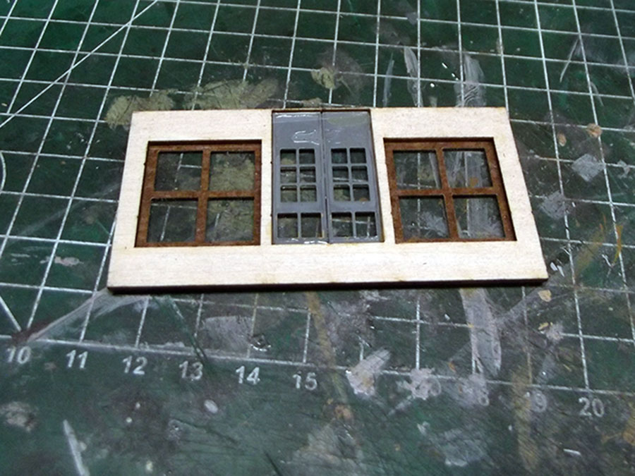 Painted the doors and windows. All paints on this kit are Vallejo, but I have several greenish colors and can't exactly remember which ones I used on this build.