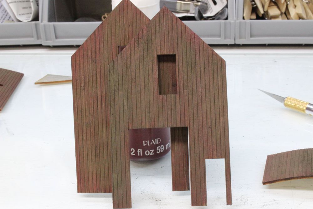 I colored the walls with a base of A&I. I then painted them with Apple Barrel Barn Red using a stipple type technique with a stiff straight brush. After the paint dried I used a wire brush to take some of the color off. I followed up with another wash of A&I and a dusting of pastel chalks. I had originally thought I was going to do a green color for the walls but I felt like red is more suited to this barn-like structure.