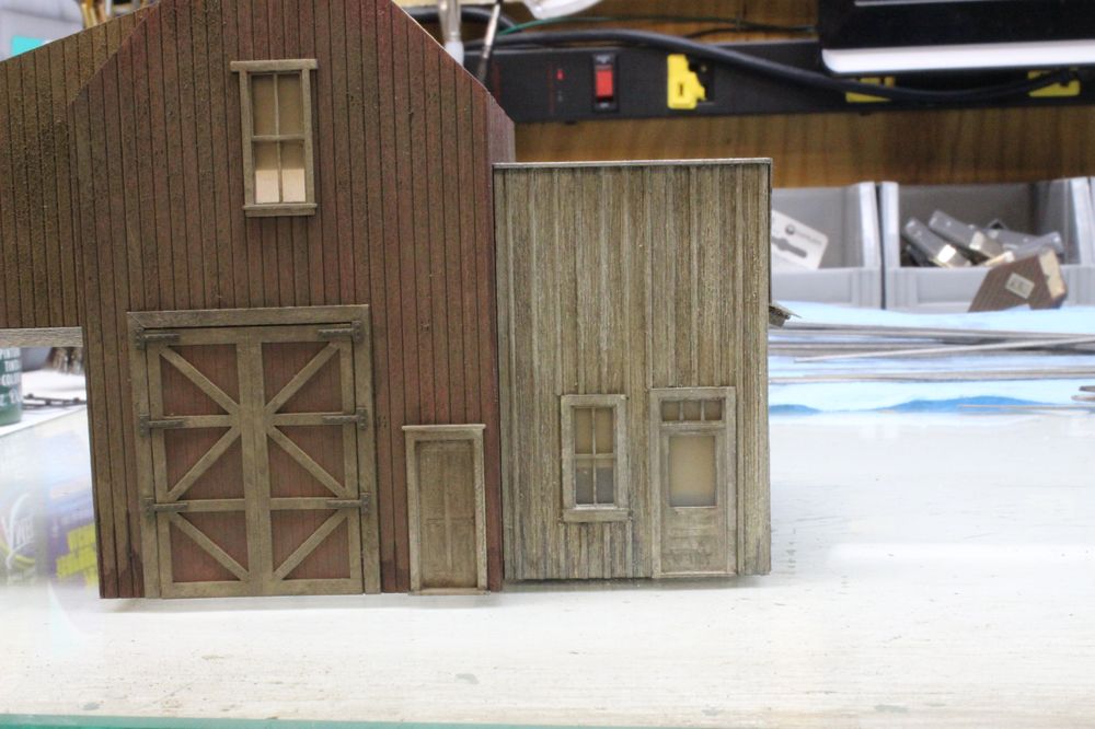 I made a little progress this week. I got the small office mostly finished. I wanted a really nasty beat up white siding color to match the dirty red walls.