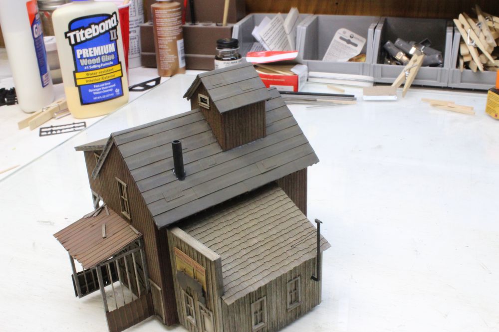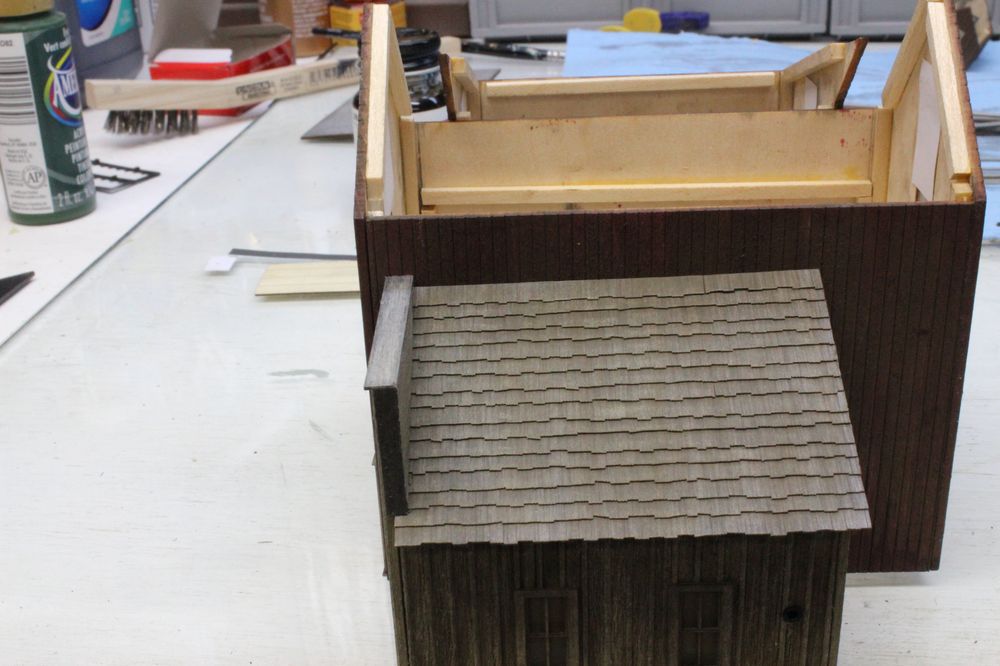 For the roof I used some Bar Mills shingles I had around. I bought a few packs of these shingles a while ago. They go on very easy and they are easy to weather up.