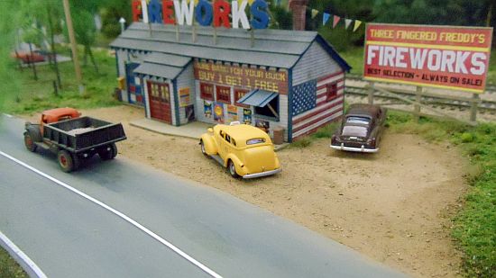 I see the yellow cab has pulled into the parking lot at Three Fingered Freddy's Fireworks.