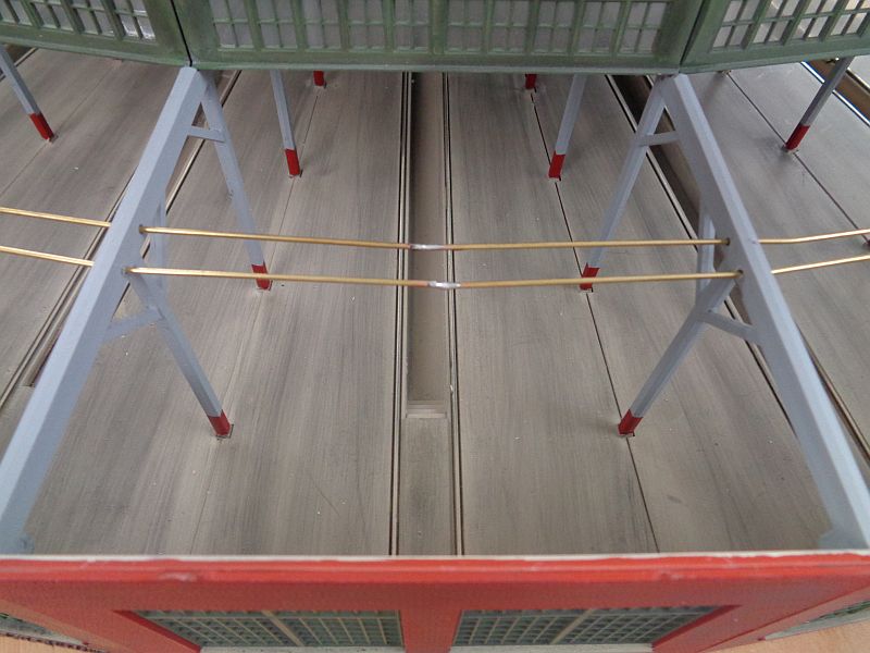 In the above picture you'll note the holes drilled in the top beams. These are guide holes for the .032" brass buss wires.