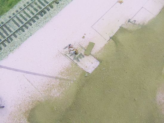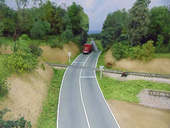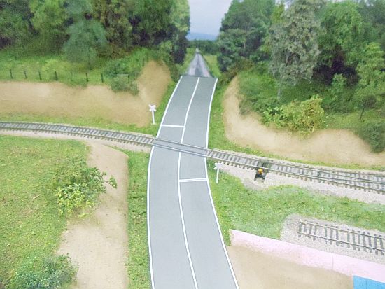 The white lines and RR cross bucks were added. Some scenery on the left sand slope was added as well.