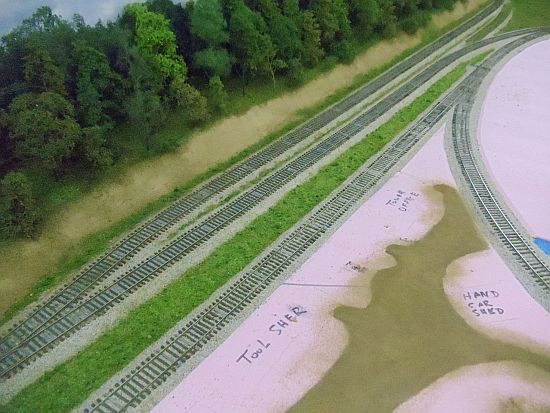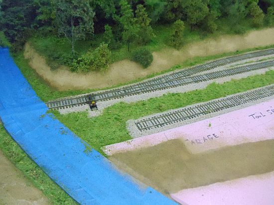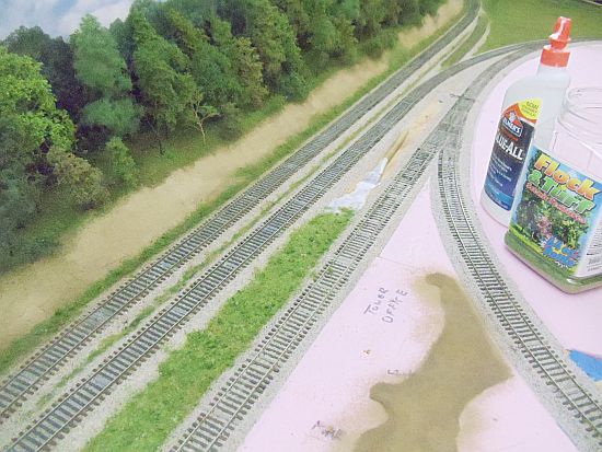I added the grass and weeds between the tracks - mainline and siding. I also added the weeds and some growth to the sides of the road. I taped the road to keep glue and water off.