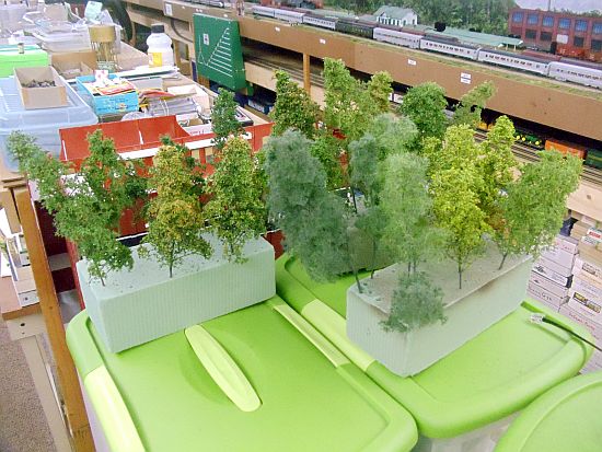 For several hours this fine day I tried to get the internet back up and running. During this time I also made another 75+ trees. I painted them early this morning with Ace Hardware Gray Primer. They were dry after 30 minutes.