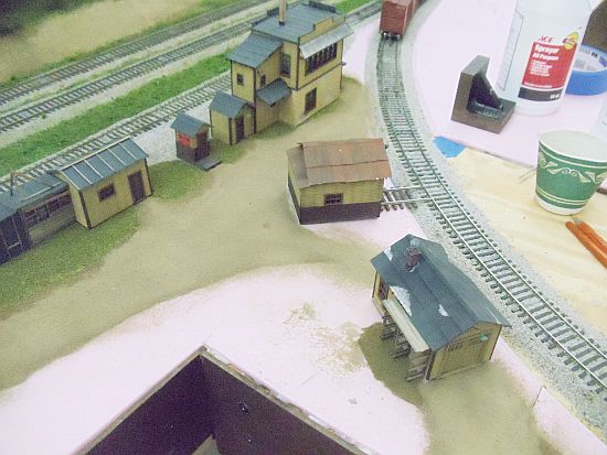 Starting early this morning, I continued the work on the Caldwell Junction structures and scenery.