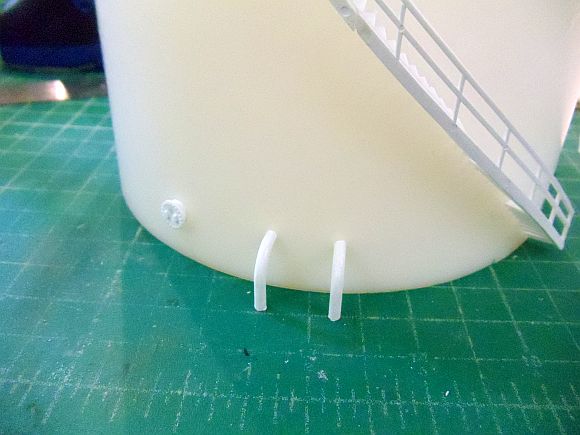 Of course as my luck would have it, the little tabs on the ladder stairs were broken off. This made gluing the curved stairs a little tricksie to the tank side. But it did get done.