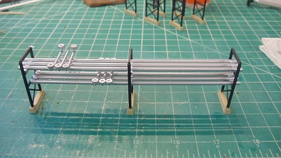 I added the small pipes to the long pipes. I don't know what to call them so I'll call them what Walthers called or named them - Parts 16,17 and 18. Yep, go figure.
