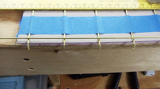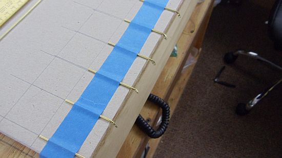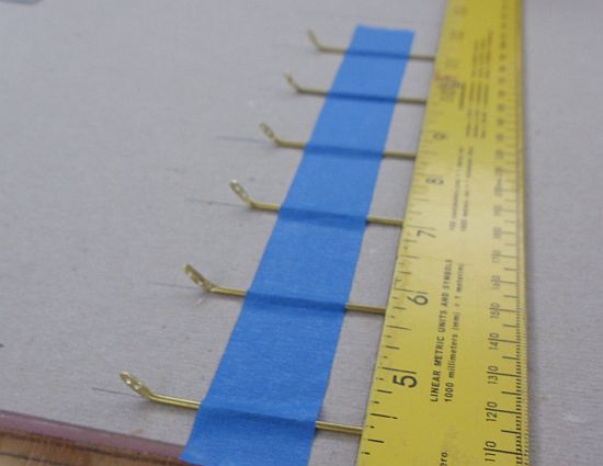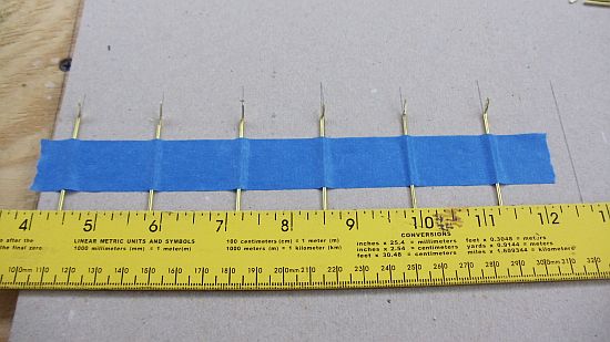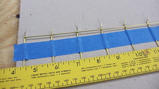 I placed the posts over the pencil line and taped them in place. I used the ruler to hold the posts flush on the line.