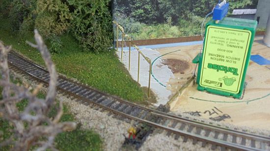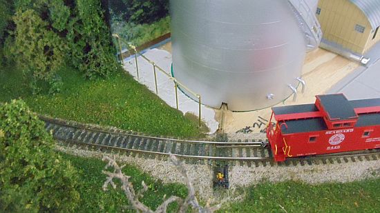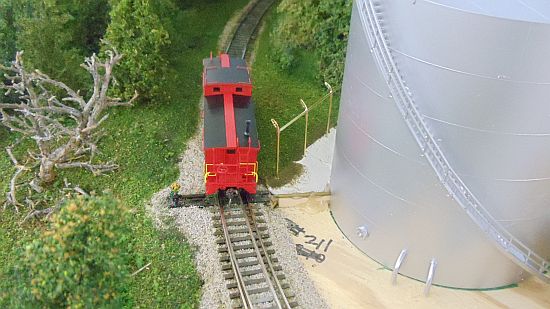 When laying out the track and moving turnouts around, this location was chosen for the business end of the #8 left hand turnout. As mentioned, the tank hides the switch motor.