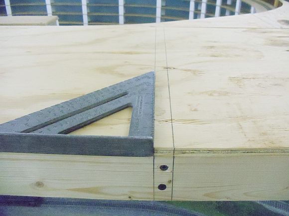 These two sections will be screwed in place tomorrow. In preparation, I used a carpenters square and marked where the cross braces are located under the plywood.