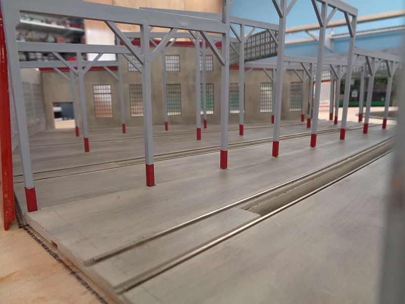 Today I repainted the roundhouse interior posts with Tamiya Sky Gray. It dries a little darker than when wet. I also used Polly Scale Pacemaker Red for the bottom of the posts.