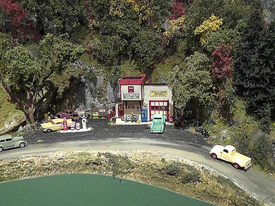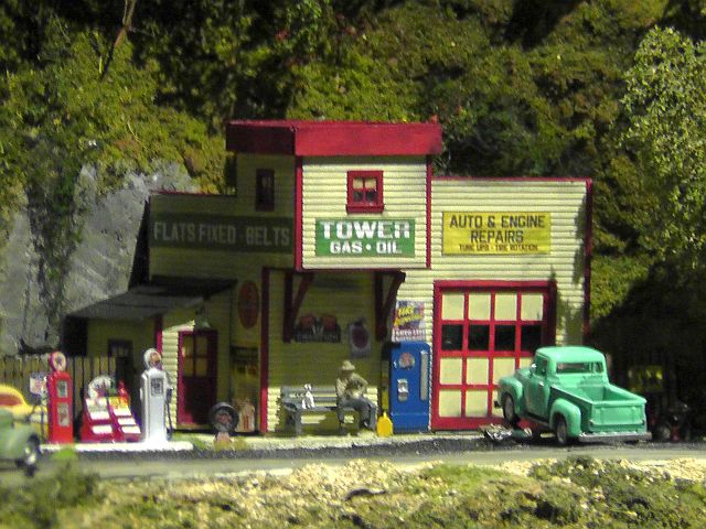 The HO SCALE INVESTMENT COMPANY purchased the under scale gas station property near Gallitzin Pa. A major excavation was needed to make way for the new gas station by Fos Scale Models. This is my version of Tower Gas. Kris worked on the scenery and we both worked on the details.
