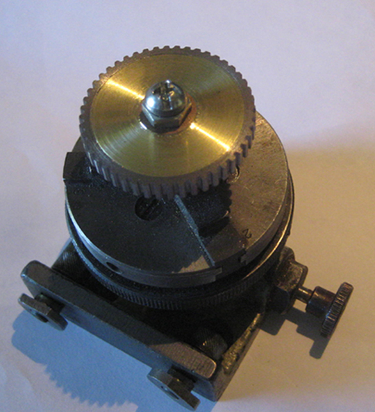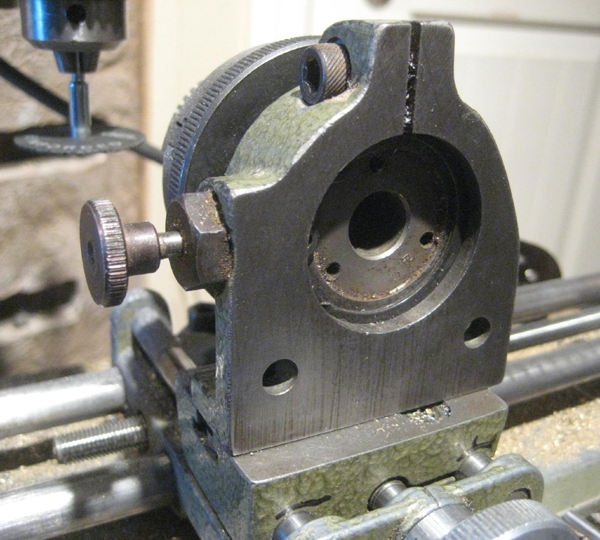 Shown on the actual table, you can see the back side of the index core for the 48 tooth core held in with a snap ring.  The thumb wheel on the left is spring loaded and drops into the various teeth of the core.  Then the core is locked at the top during cutting to prevent any motion.