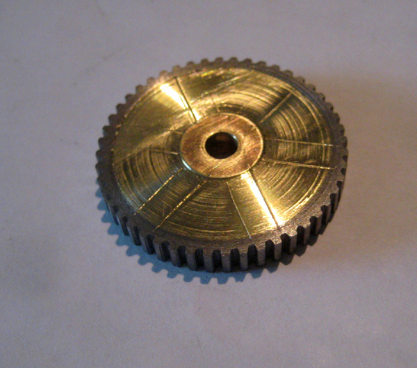 So here is the cut gear.  Normally with a gear hobber the leading and trialing edge of the teeth would be cut at the same time.  This allows for the rolling radius of both the bull and pinion gears.