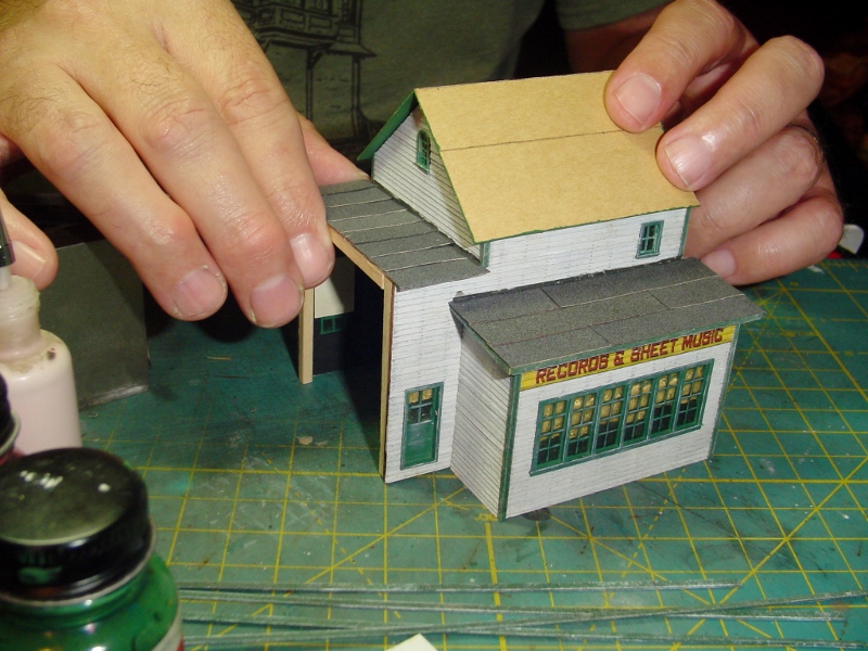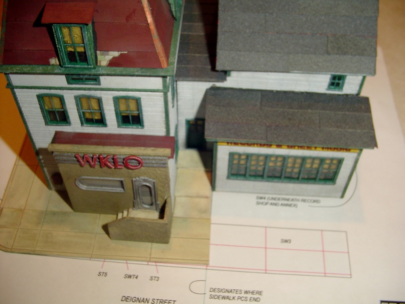 Nothing has been glued down yet but by rearranging the sidewalk pieces as I had previously described the windows in the rear won't be half covered by the music store.