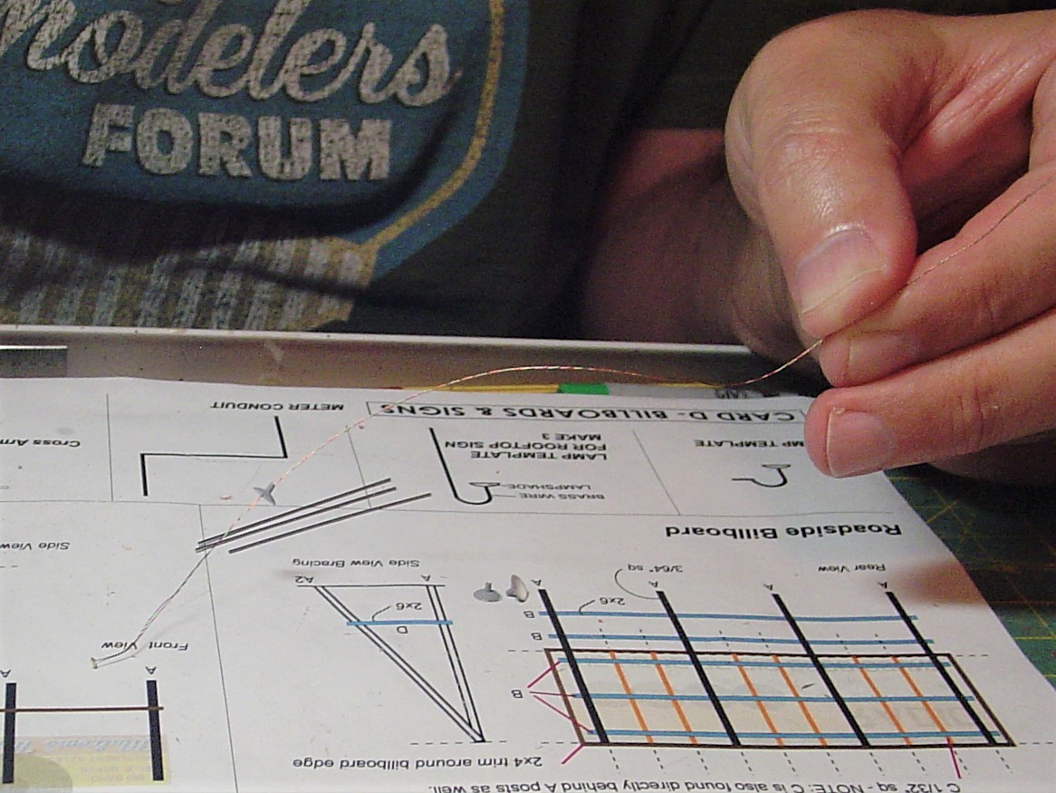 I glued the three completed lamps to the back of the large WKLO sign and then wired them in series.  I'll spare you the pictures of me trimming the wires to size, soldering them together and muttering to myself as I did so.  In the end I had one Positive and one Negative lead that I had to run down on post and into the interior of the building where I had a connections (with a current limiter in place) all ready for them.
