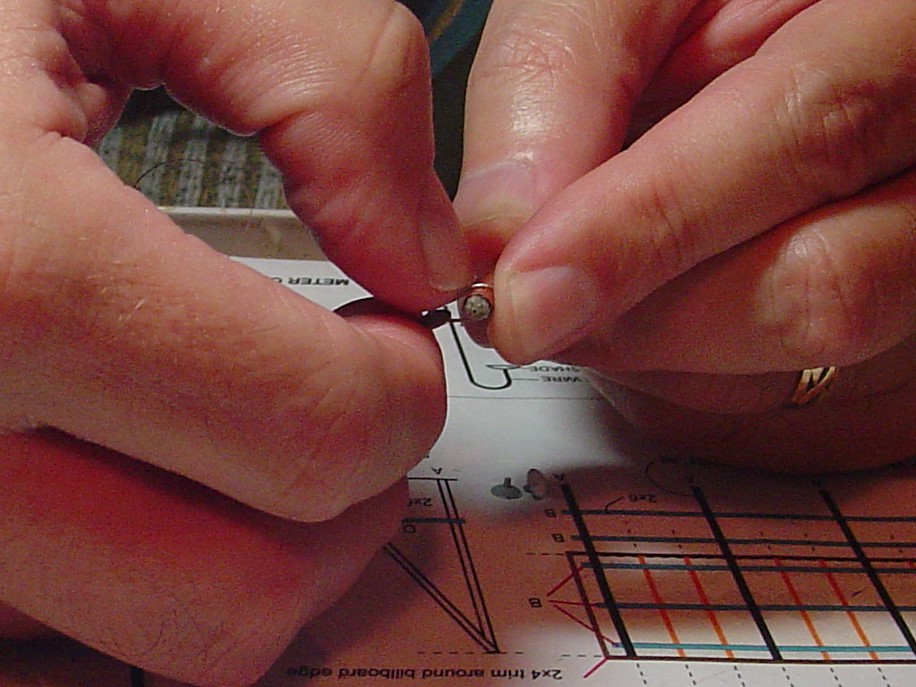 I needed to make up three lamps for the big WKLO sign.  Only I wanted mine to light up.   8)  Instead of using the brass wire included in the kit I cut three pieced of .018 OD tubing (purchased from your friendly neighborhood light merchant Slim Jerkins at Microlumia).  I use razor blade and a rolling motion to cut through them and then an emery board to clean up the end.  You don't want to pinch the end shut when you cut them!