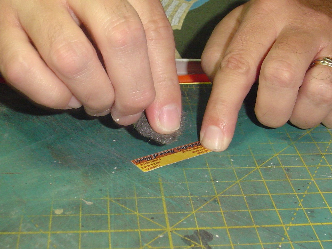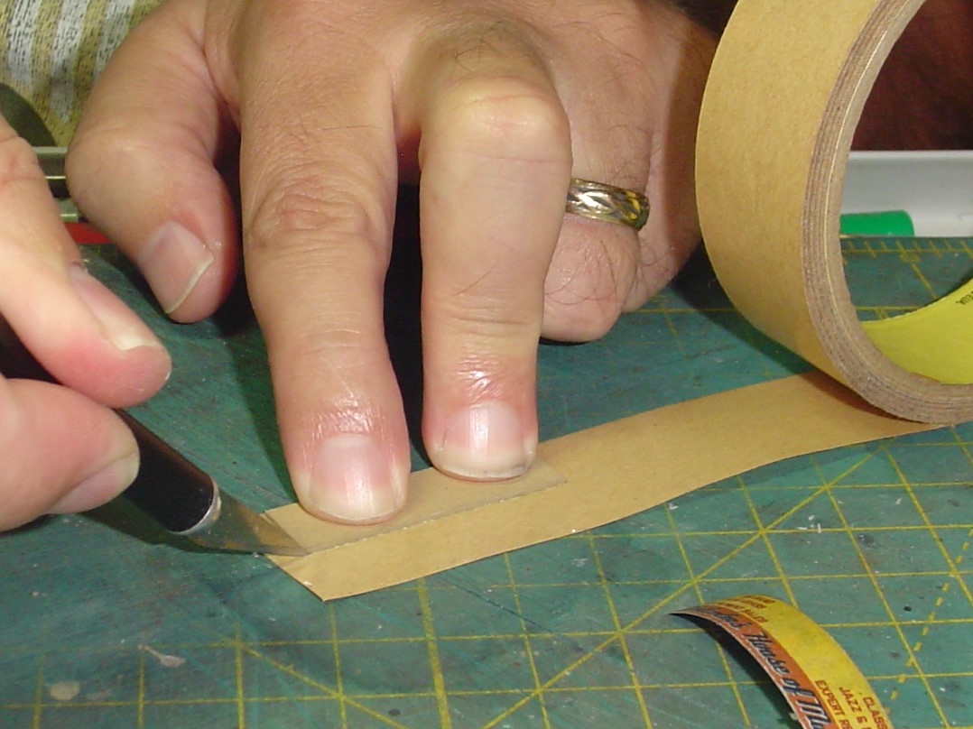 Next up I'm going to cover building one of the billboard/rooftop signs.  I first cut out the sign using a steel ruler and sharp #11 X-Acto knife.  Notice that the ruler is positioned over the sign.  If the blade wanders away from the ruler a little bit it isn't cutting into the sign.