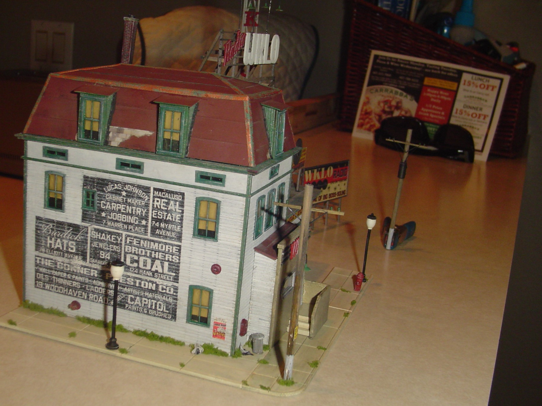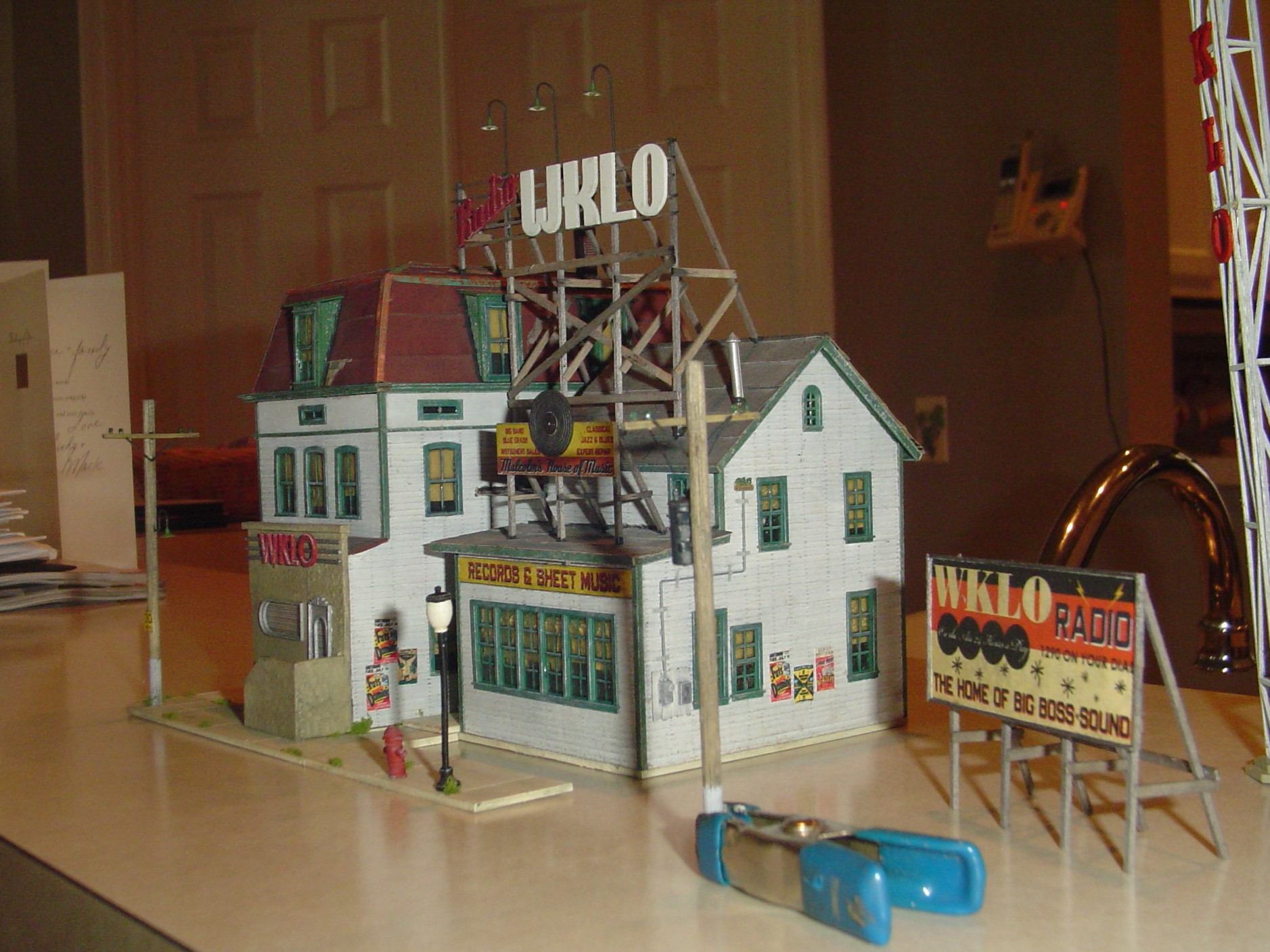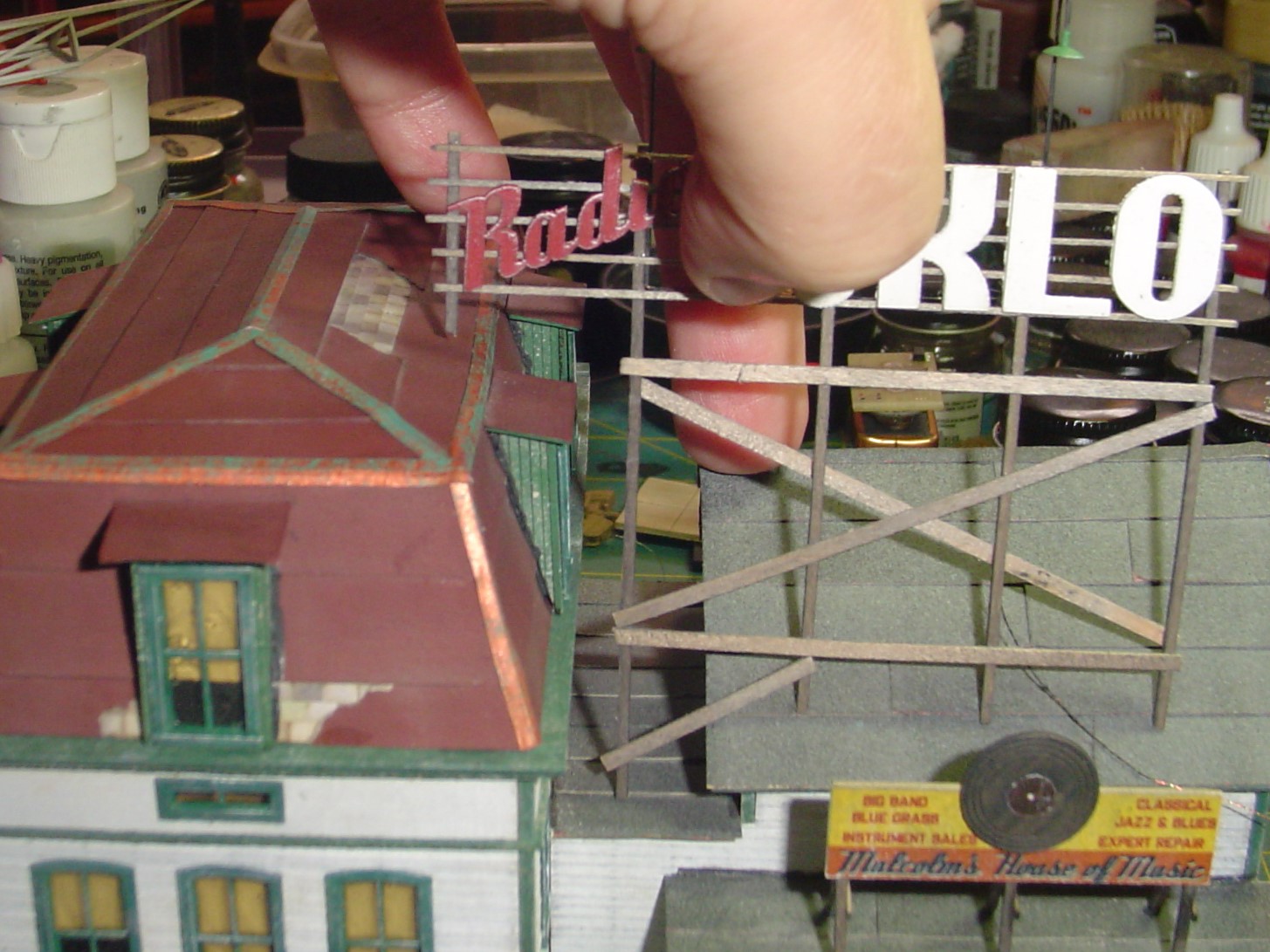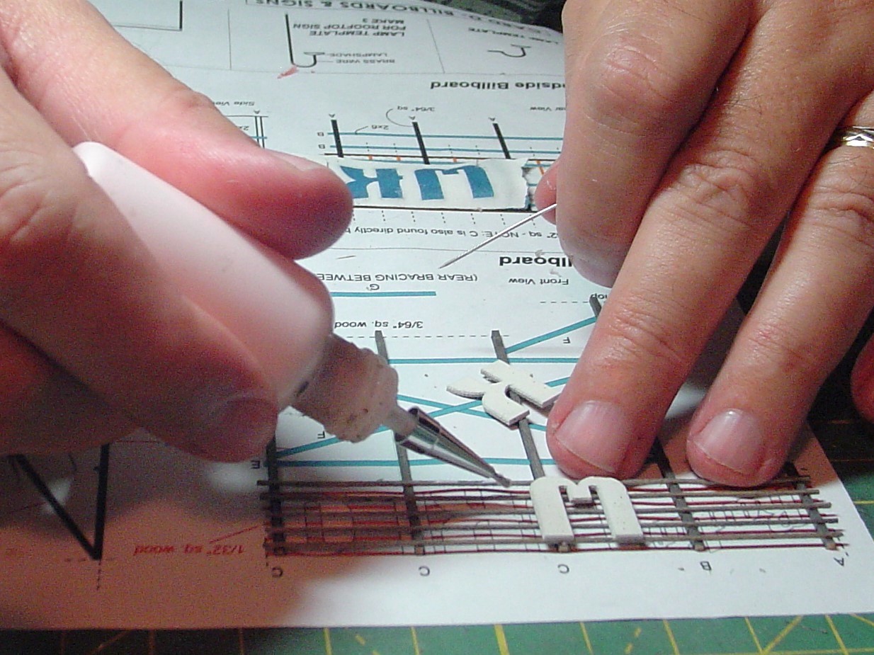 The big WKLO sign was built over the template as well.  In this case I did glue some of the parts directly to to the template using the tiniest drop of white glue at each end.  Barely enough to hold them in place.  Then the cross pieces are glued in place and the letters added.