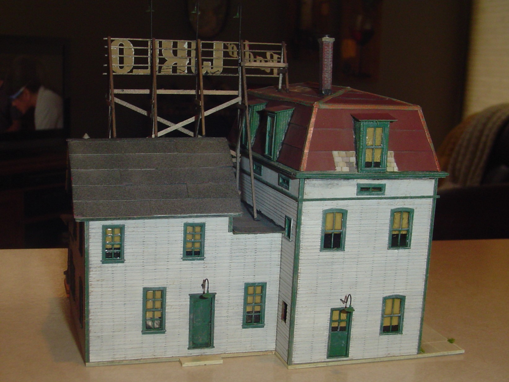 When I positioned the sign on the roof for a test fit one post (the on on the left) was just a tad short.  So I removed it, cut one slightly longer and glued the new one in place.  Resting on three different roofs like this sign does means I can't really make my roofs removable which is something I prefer to do, when possible, so the lighting can be accessed if need be.  I lightly glued the roofs in place and hope that "if need be" never comes.   ;)