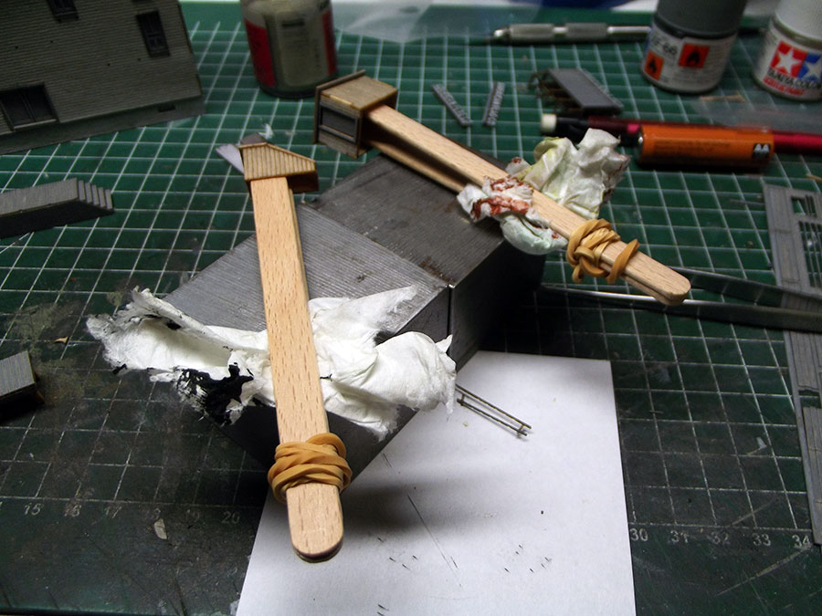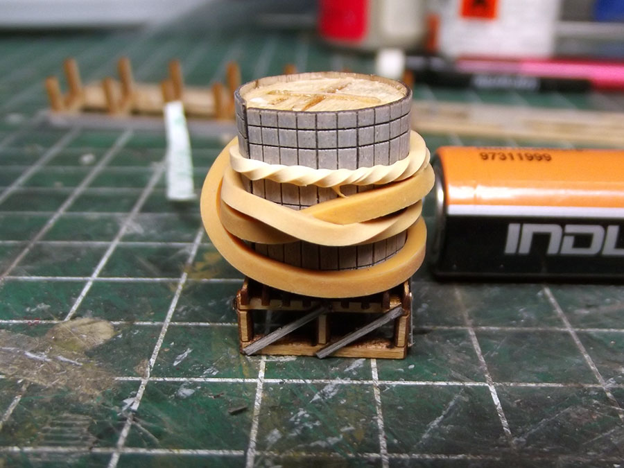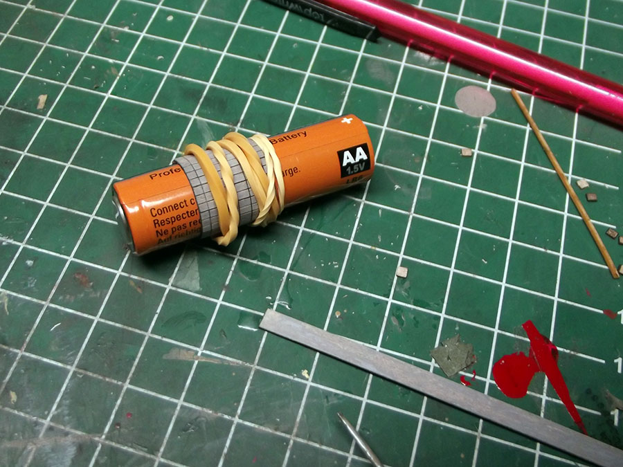 While waiting for some painted parts to dry I started on some sub-assemblies like the watertank. An AA penlite was the exact right size , I soaked the wood part in water and then wound it around the pennlite with elastic bands to create the right shape.