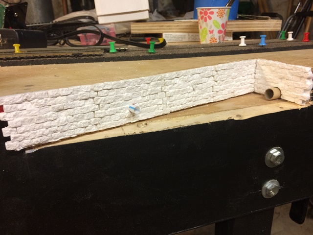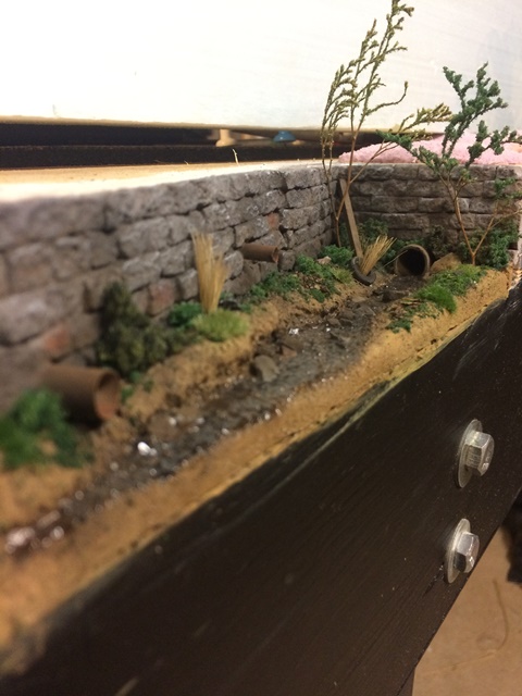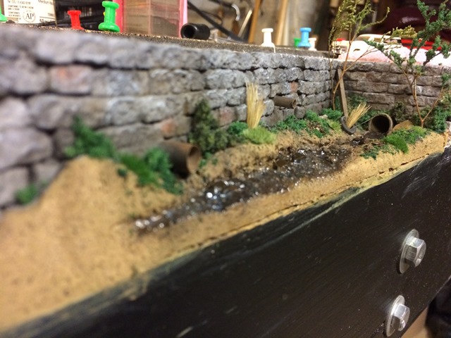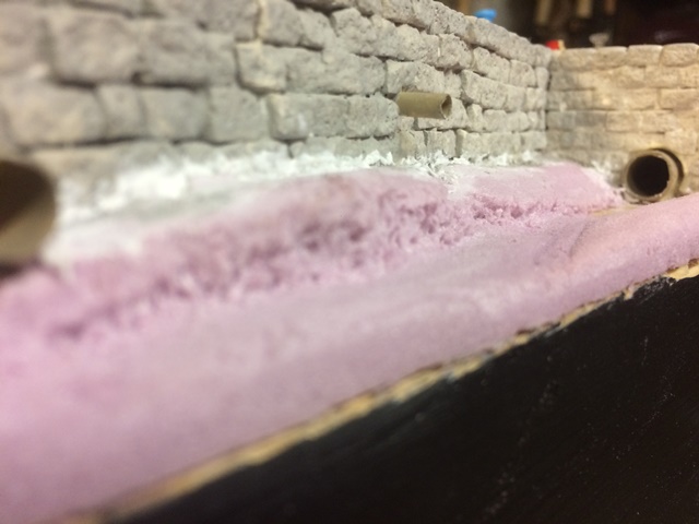 I included a concrete drain at the far end (a piece of cardboard tube,) a large drain pipe (a soda straw,) and a small drain pipe (a plastic coffee stirrer.) Those were drilled through the plaster walls and the wood supports beyond. All was glued in with epoxy. I then added some foam topography to form the stream bed. I carved and sanded this to create the banks, including some undercuts. I picked at the foam with an Xacto blade to roughen the undercuts up. The rest of the surfaces were sanded smooth.