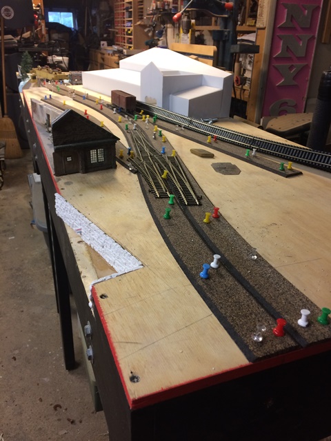 I have begun fabrication of the roof structure of the machine shop. This is complicated by the fact that the building is both a cut away and joins the front fascia at an angle. In order to wrap my brain around it, I built the basic roof from cereal box cardboard. I then began building and gluing each primary truss to the cardboard. In between I installed Evergreen v-groove styrene sheet. On top of that I added secondary rafters and purlins. Once all of those are installed, I will install all of this to the building and then add the intermediate rafters. The interior ceiling and trusses will be painted brown. This will help hide some sins, including the fact that the v-groove should have run in the opposite orientation.   :-[