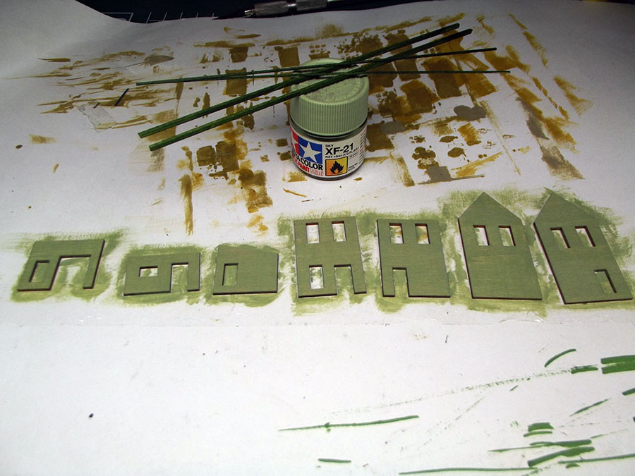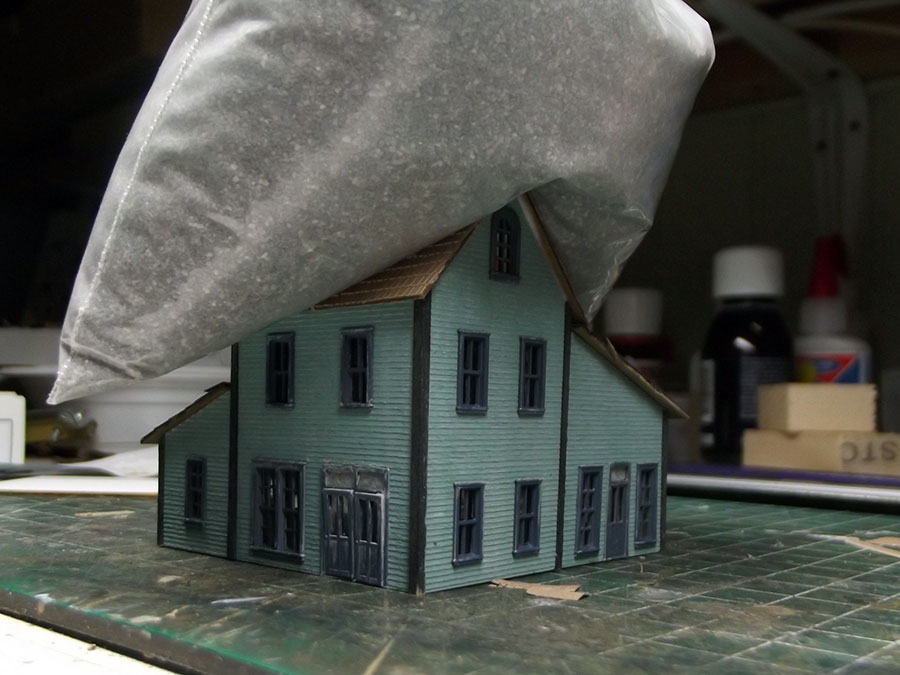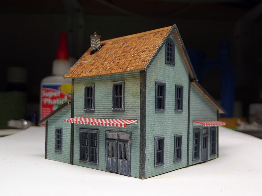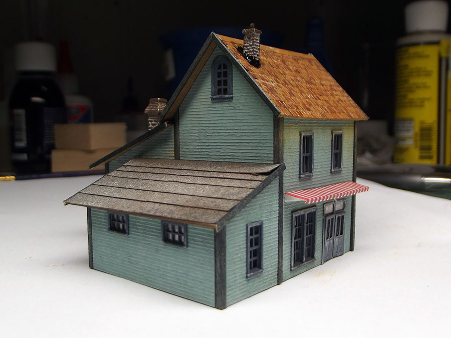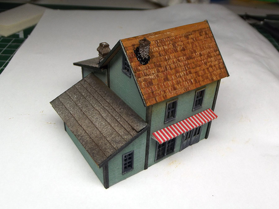 Assembled awnings , chimneys and sprayed the roof with matte varnish to blend all together.