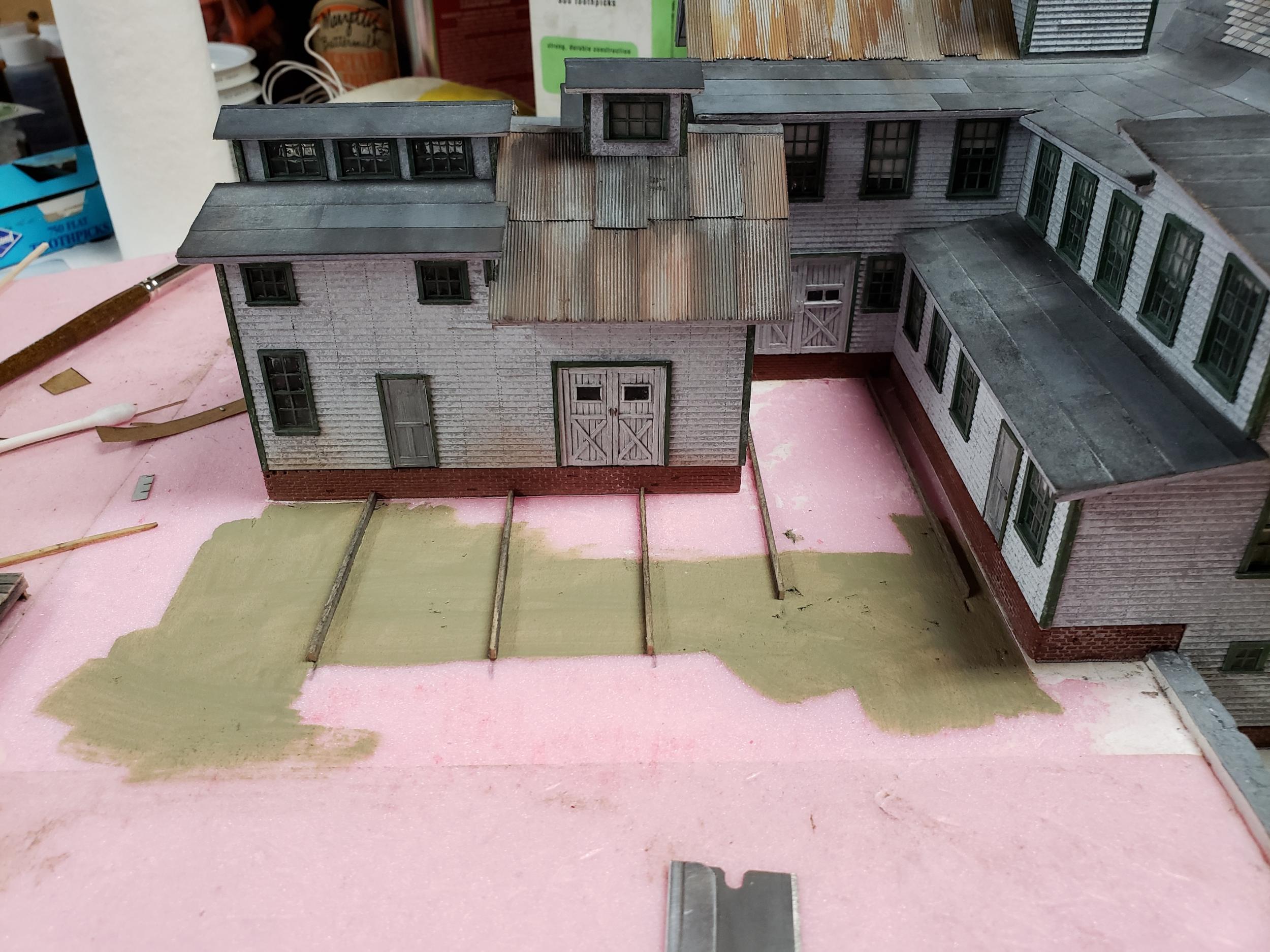 • In addition to the ramp, you can see that I have two small sets of steps. Again, this is because the doors are so far above the ground and I did not want to hide any more of the foundation than necessary. The steps are "scratch built" using commercial stringers from Banta Model Works and some strip wood I had on hand. The Banta stairs kit comes with treads as well but I felt they were too out of scale. When installing the steps, I first glued in the stringers and then glued down dirt between and around them. Once that dried I glued down the treads. All of this was to make sure I would not have a problem gluing down dirt that would be visible but hard to install because the steps would be in the way. Same thing for the ramp. A total of 4 sets of steps are needed. You see two here (brick extension, north side) and on the east side of the complex.