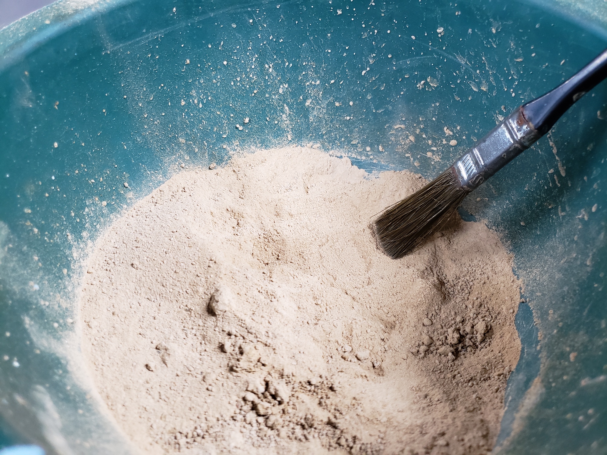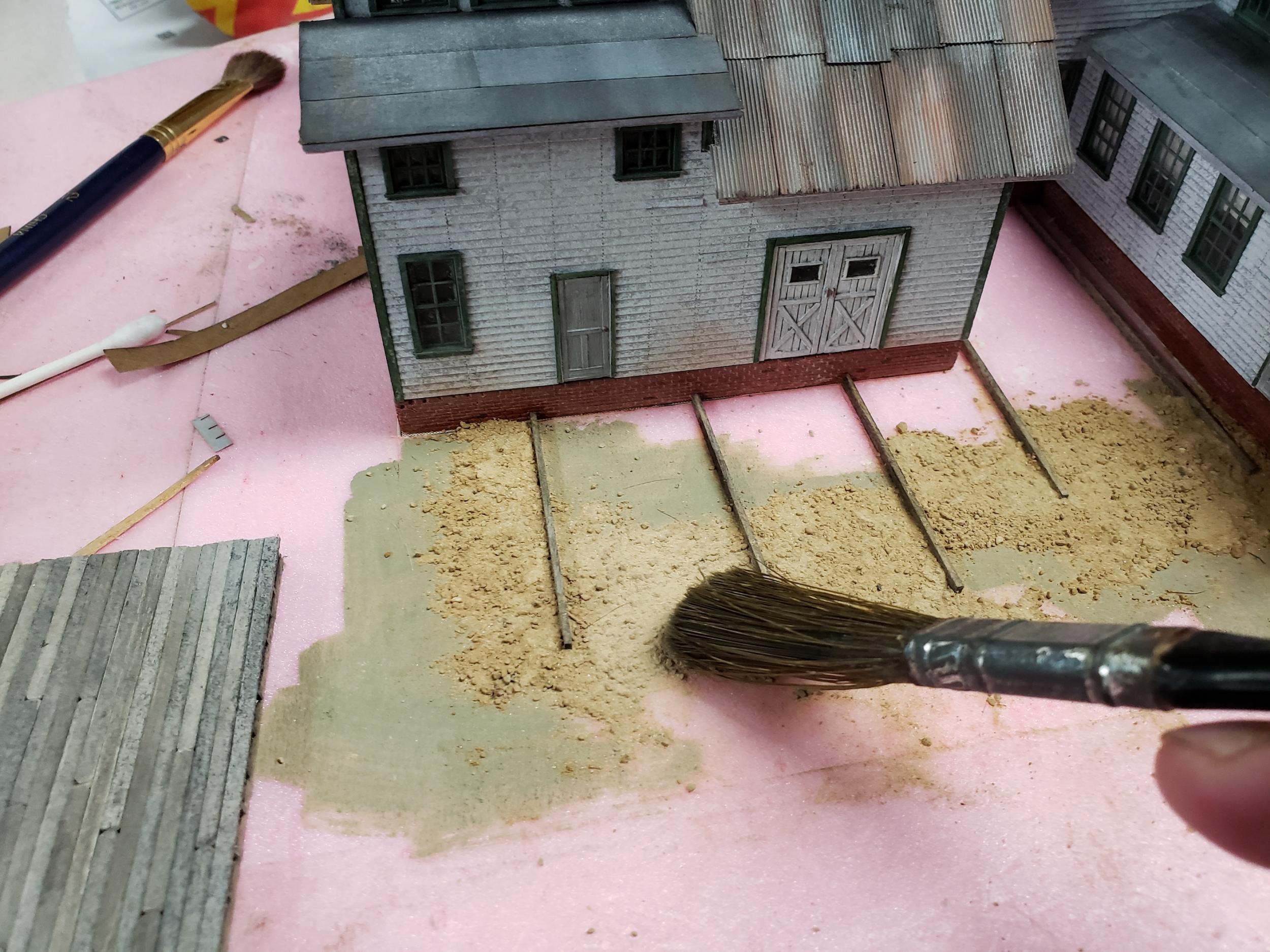 The glue solution darkens the dirt considerably -- too dark to my eye. So, once it's dry, I go back and "dry brush" more dirt on top:
