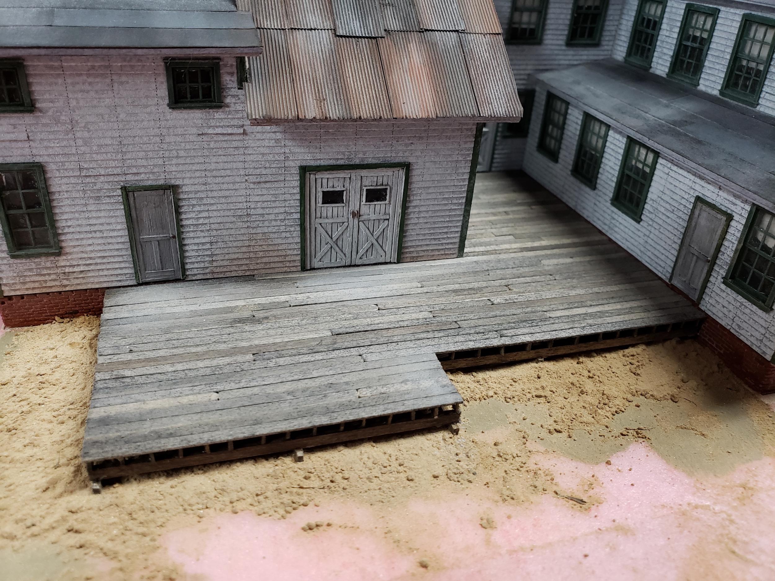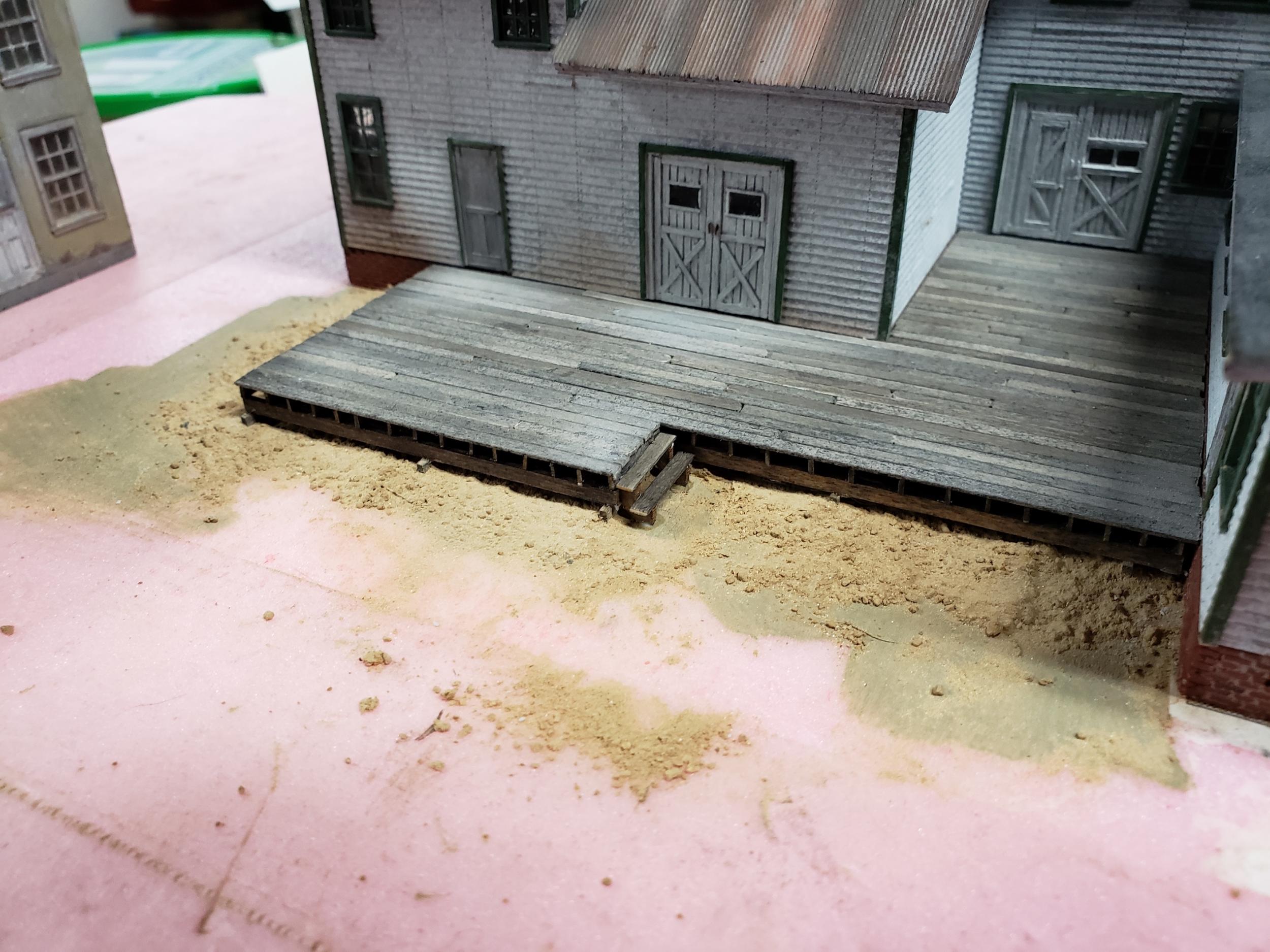 With the foundation ready, I glued down the deck. One more treatment I gave the deck was to scrub in some of my dirt mixture onto the top. It helped tone down some of the stark variation caused by the inkahol and chalks. Here's a long shot of the deck in place: