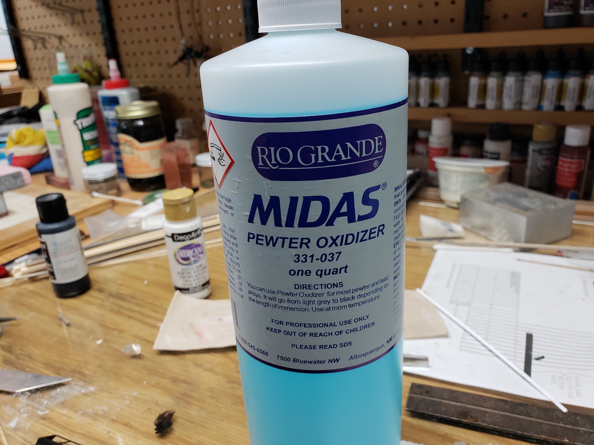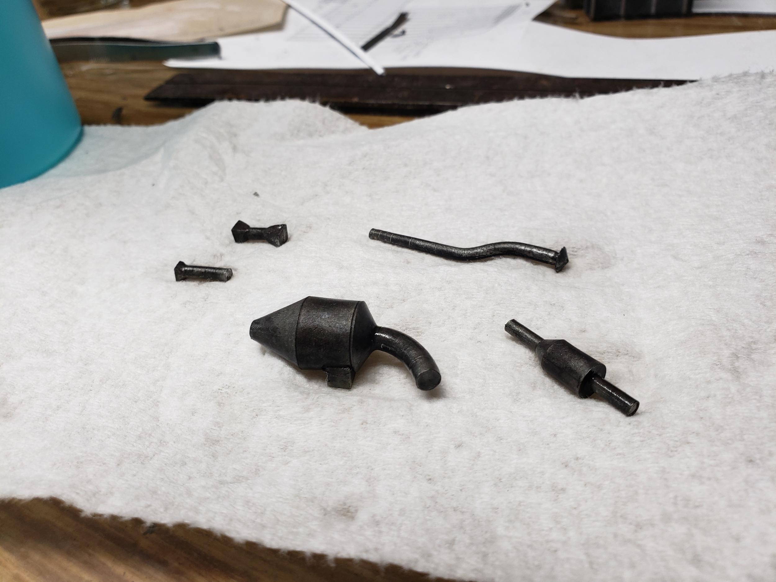 I apply the blackening agent with a cheap testors paint brush and let it work a while. Once everything is pretty black, I toss it in a yogurt cup full of plain water to wash the acid off. Then set the castings on a paper towel to dry. Here are a few: