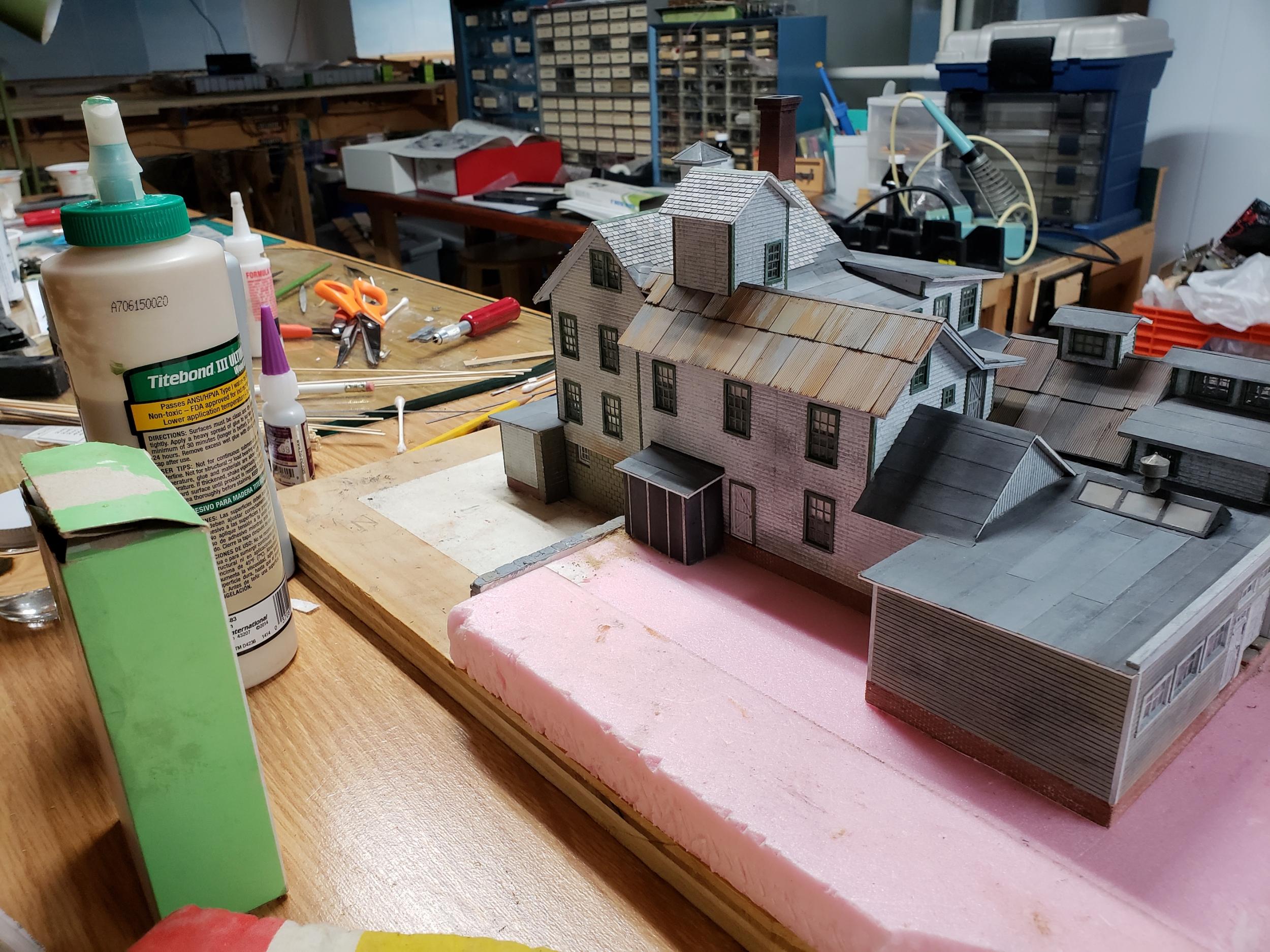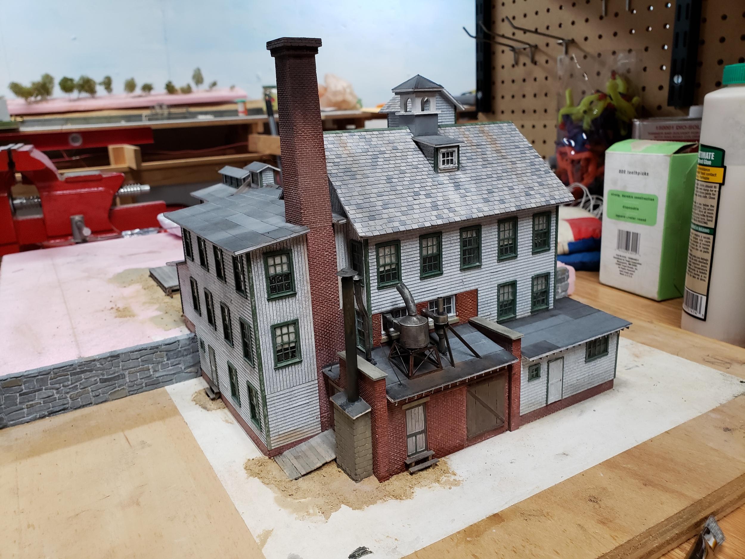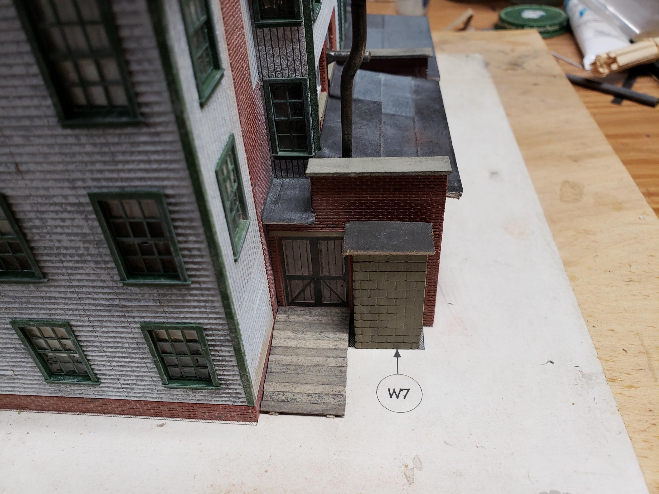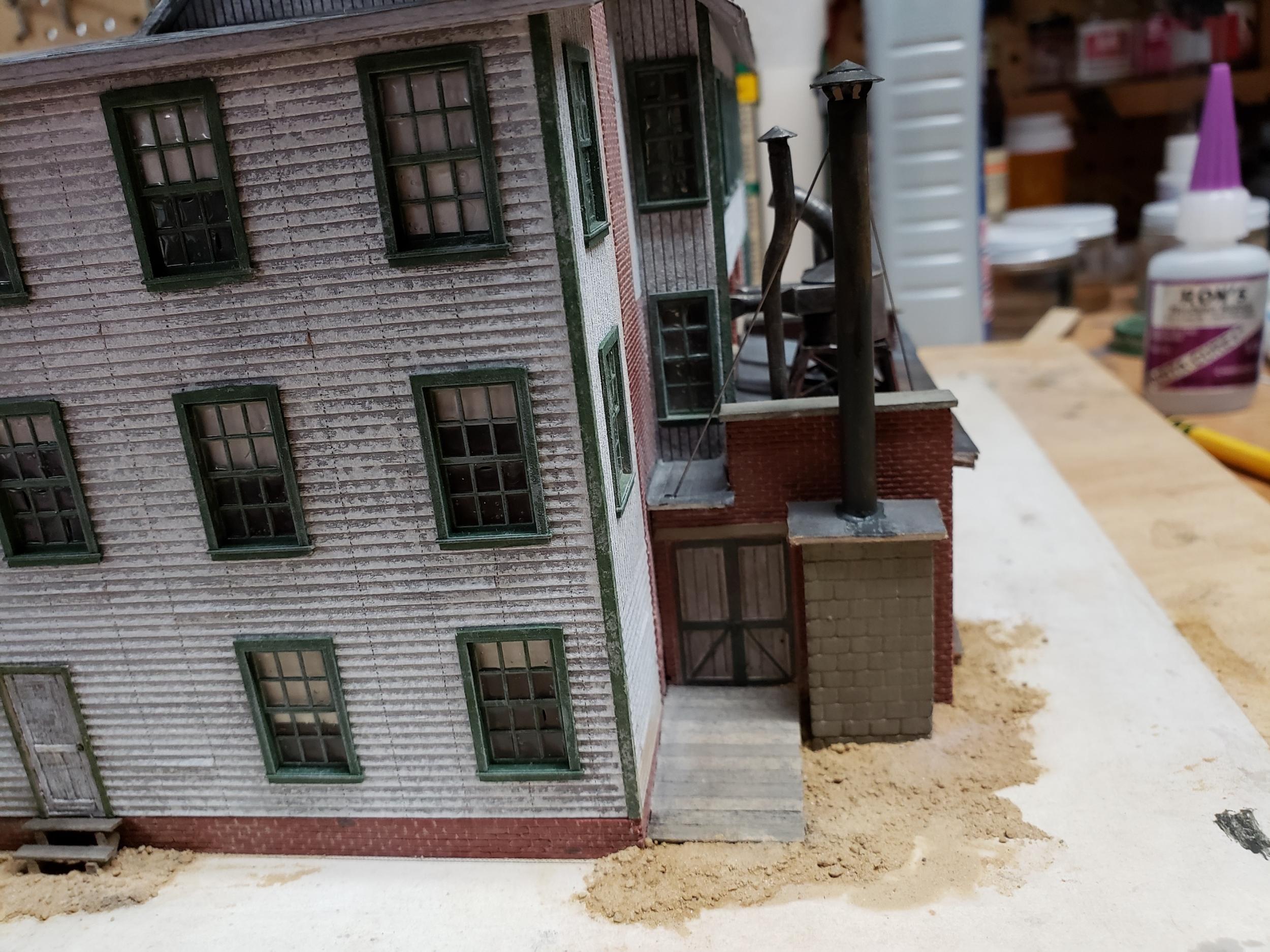 In this picture you can see that I installed one of the stacks coming up from the brick extension building. Also, if you look closely behind it, you can see a short piece of piping that comes out of the Main Building that goes to one of the ventilators. That was a pain. It is a small metal casting glued to the brick wall. I used Canopy Glue that had to sit a while until it was set up and tacky enough to hold the cantilevered piece on the wall. After a while, it worked. Fortunately, it's pretty light. Any heavier and would have needed to build a stand of some sort to hold it while drying.