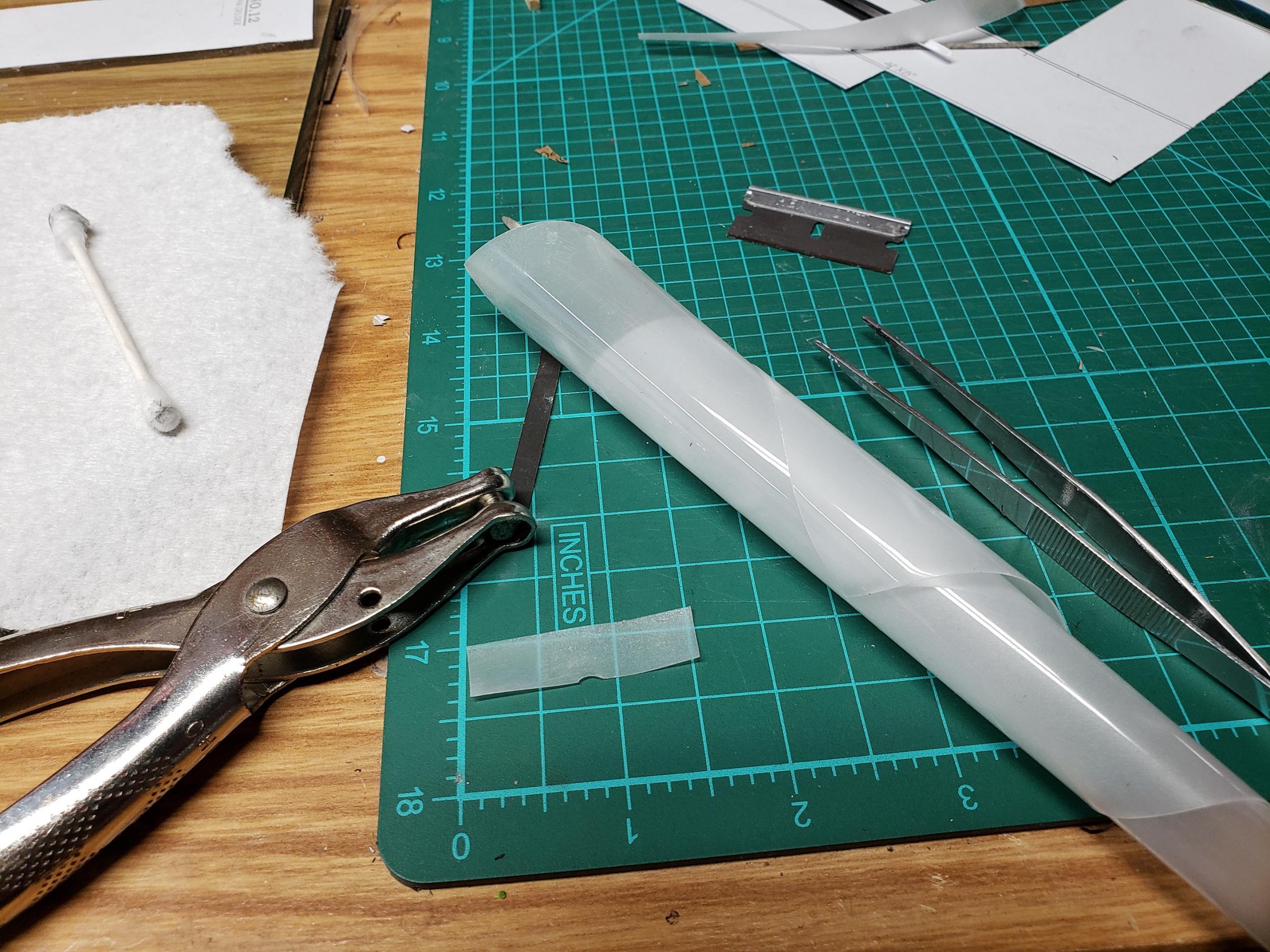 The complex has a skylight over the garage door in the south extension. Like many kits, it's a piece that just sits atop the roof - there are no holes cut in the roof to create a "real" view. So, as everyone else does, I fogged the windows. I took the piece of acetate that comes with the kit and sprayed it with Krylon matte finish. Went to bed and found this in the morning: