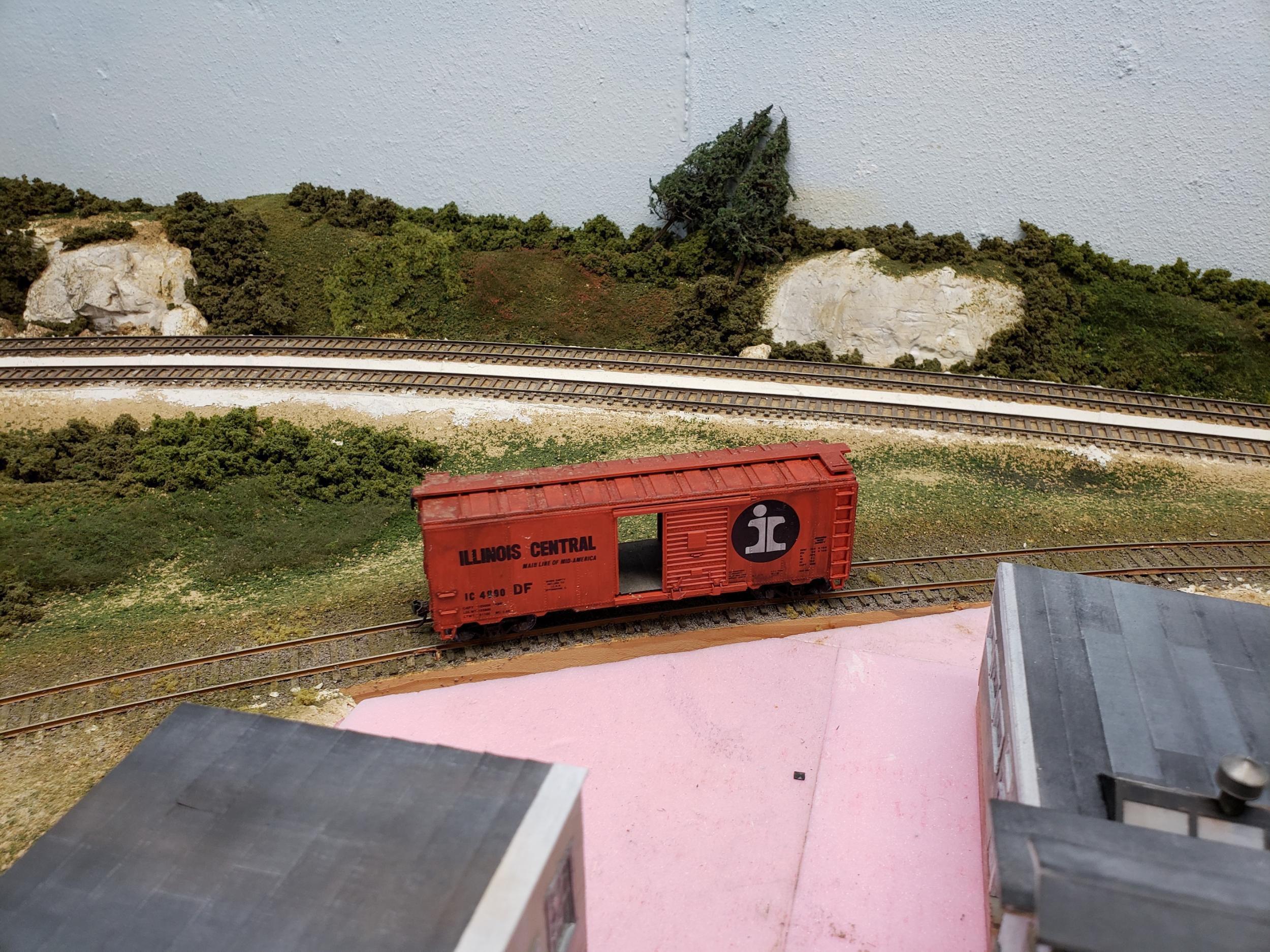 As you might have seen in my layout build thread, I'm gutting the minor scenery I had in the town of Monee so that I can put in a proper backdrop and also upgrade the basic scenery techniques. This diorama will ultimately be sited at the north end of that town. Even though I am not finished with Rugg, yet (some stairs, power poles and lines, soil pipes, and some misc detail/clutter to be strewn), I thought I would do a test fit of the dio in the frame I have built for it and shoot a few pictures so that I can think about how I want to portray that in the final scene. These are the last few pics I have of Monee now before everything was ripped up (posting that next on the layout build thread).