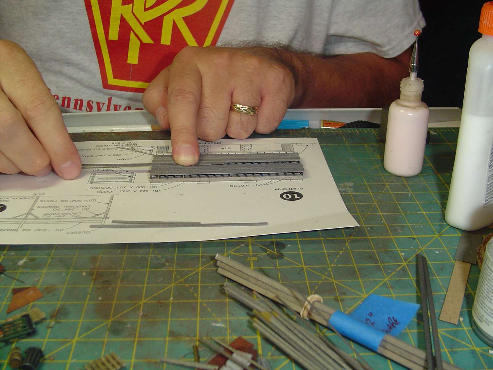 The loading dock was next.  This starts out by building a front and rear set of supports directly on the template.  The tiniest spec of plain white glue applied to the ends of the strip wood was used to glue one of the long pieces directly to the template.  Then everything else was glued to it.  When the glue dried I removed the entire thing from the template by sliding a razor blade between it and the template.