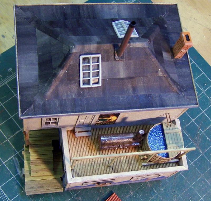 Moving on to the roof, which went together quite easily from cardstock forms, I added tarpaper roofing material. This was produced from the supplied piece of "newsprint," brushed with thinned weathered black and driftwood stain. The technique produced really nice tarpaper. You just brush on the paint in a consistent direction, dipping first in Dio-sol and alternating between the weathered black and driftwood without cleaning the brush. After the paper dried, it was cut across the brush strokes in half-inch strips and then layered on. I really like the effect, although I don't think my photos capture the character well.