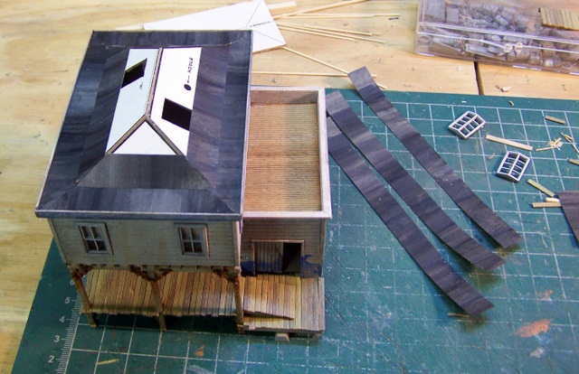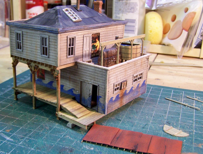 I added the roof skylights (metal castings) and the tall smoke pipe. Work on the cannery porch has taken up most of my time since. The canopy and supports were delicate work, as was the water holding tank. But following the detailed directions, all came out well. Since the porch details are easier to add before installing the canopy, that will be just about the last step. (in porch construction, not the build)