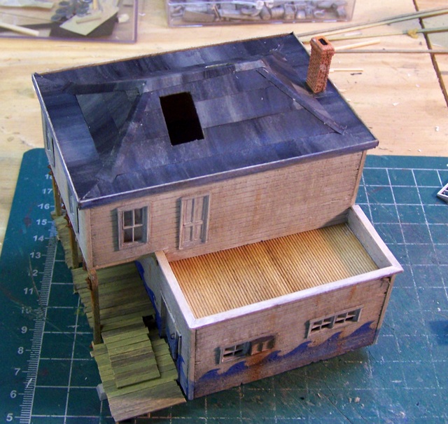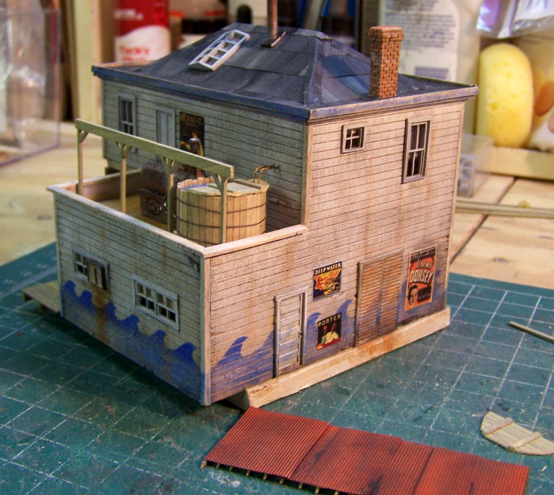 A small roof was also added above a door on the other side, but the pic came out a little blurry so I'll show that off with more progress another day. I have guy wires to attach to the tall smokestack, a wall smoke jack, and a few more details to add. The largest feature of this structure, the concrete seawall below the porch side, will have to wait for inclusion until I am ready to locate it on the layout.
