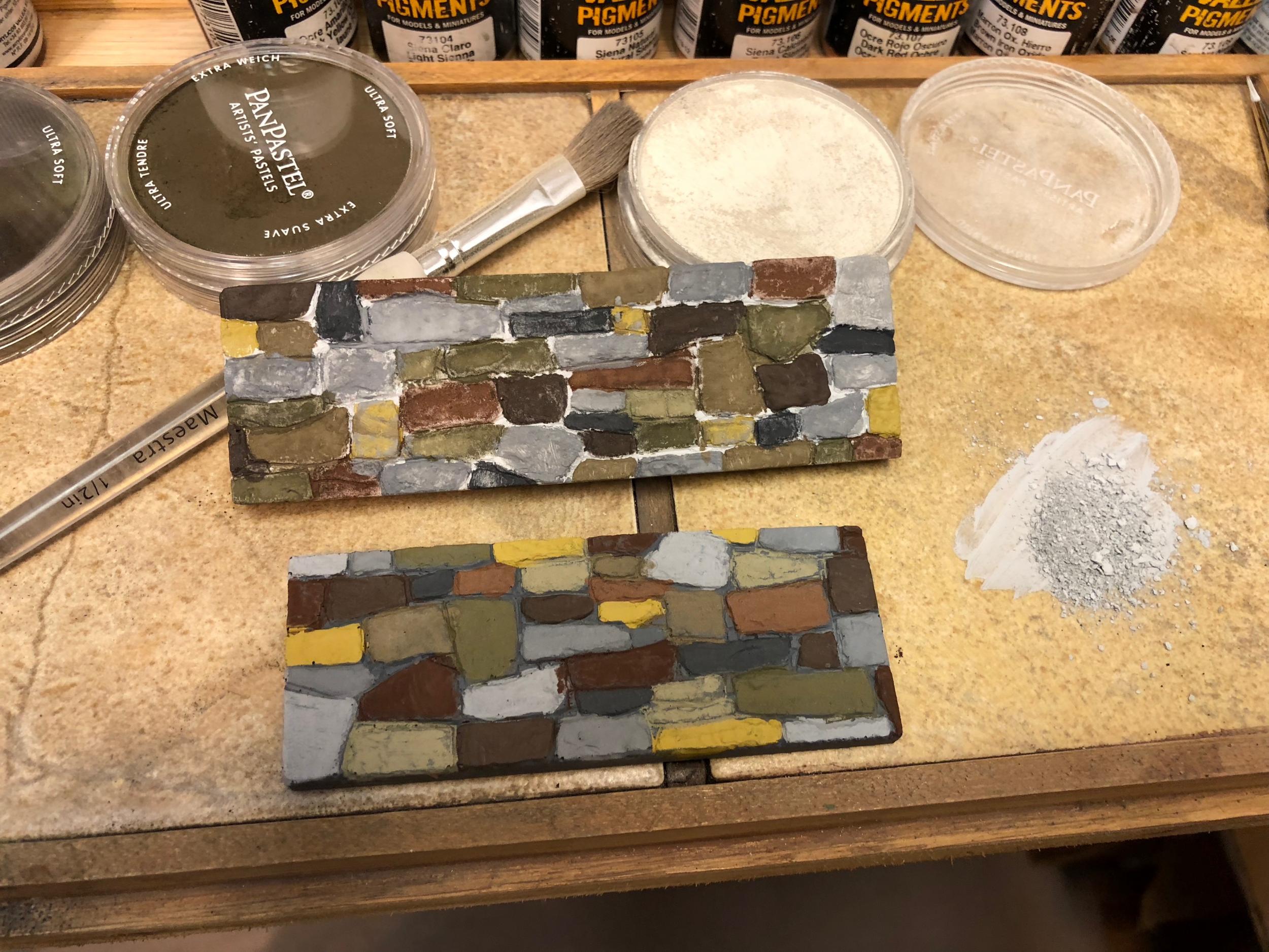 Once each of the stones of the wall were painted (I'm using 8 - 10 different colors of pan pastel and Rembrant pastel chalks) using the pastel powder and alcohol - I then painted the mortar lines with a light grey powder and alcohol.