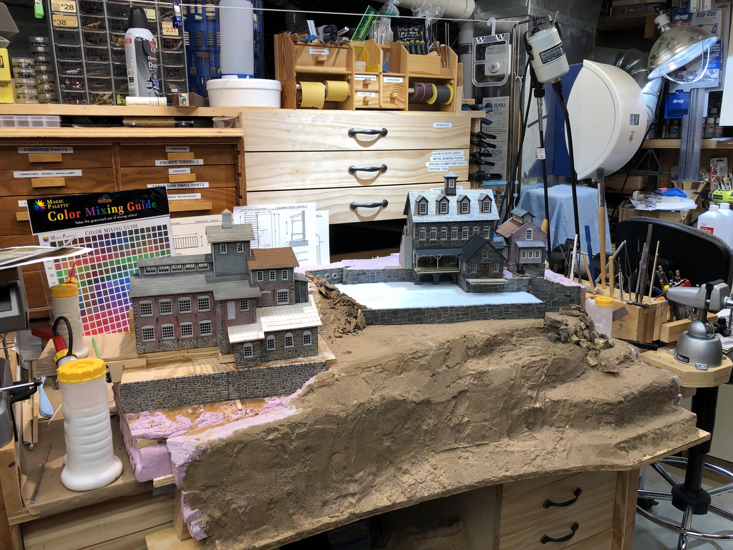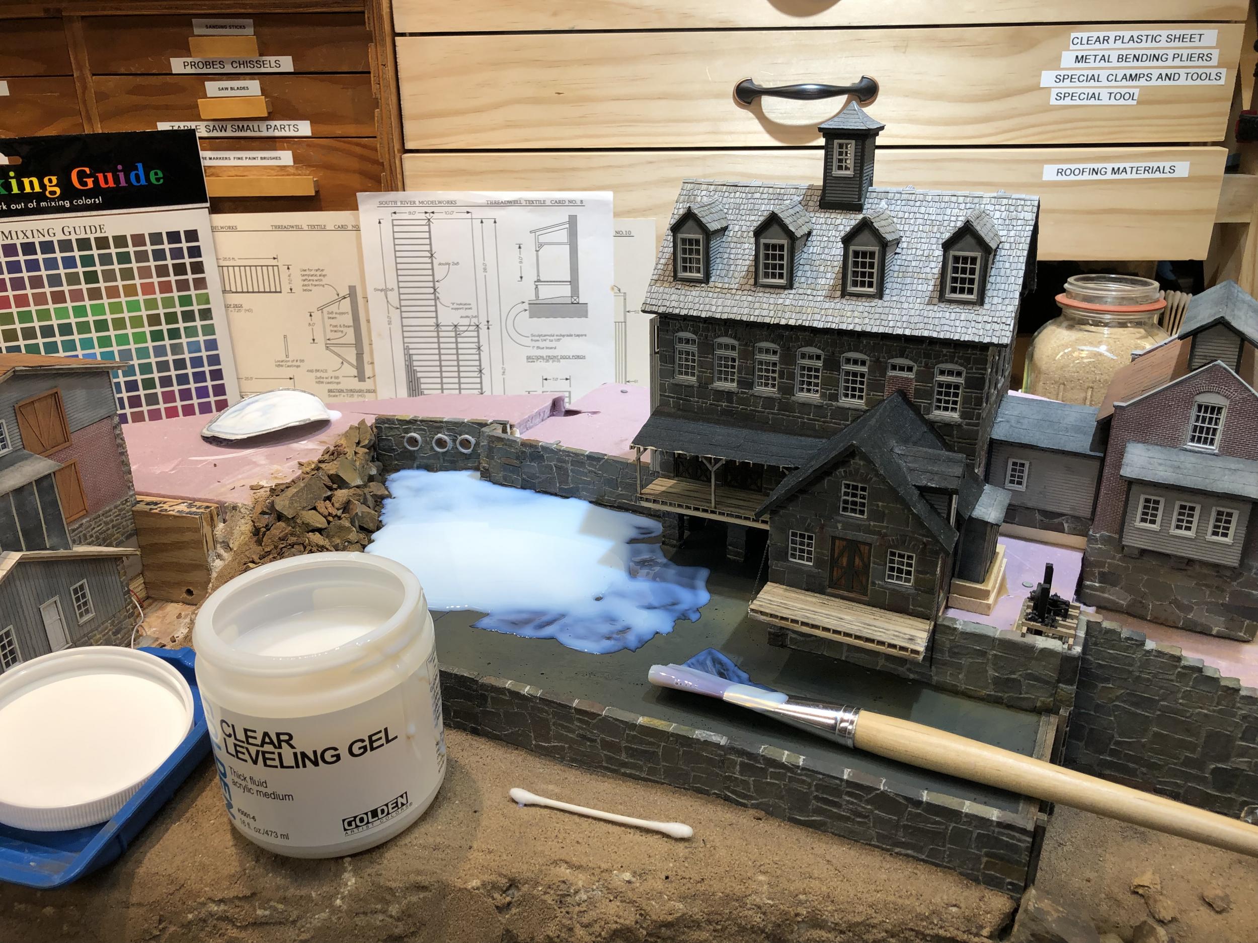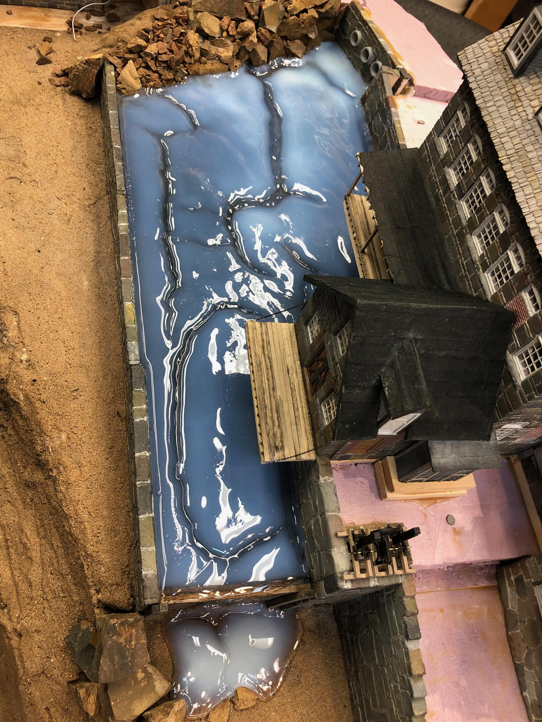 Today, was water pouring day on this build. I added some rocks along the left side of the mill pond, and down below the dam, where the river will start, and then poured the first pour of water.