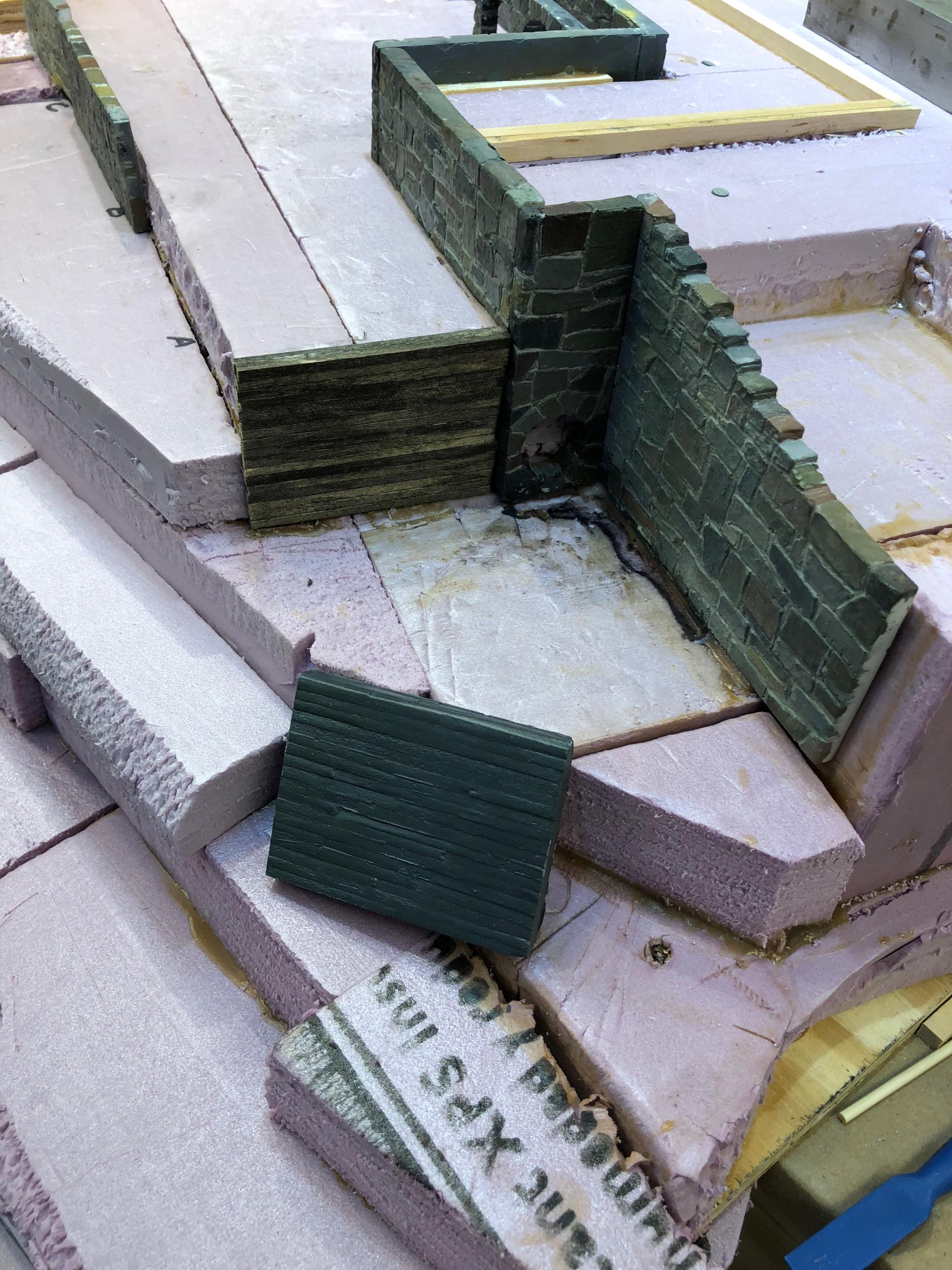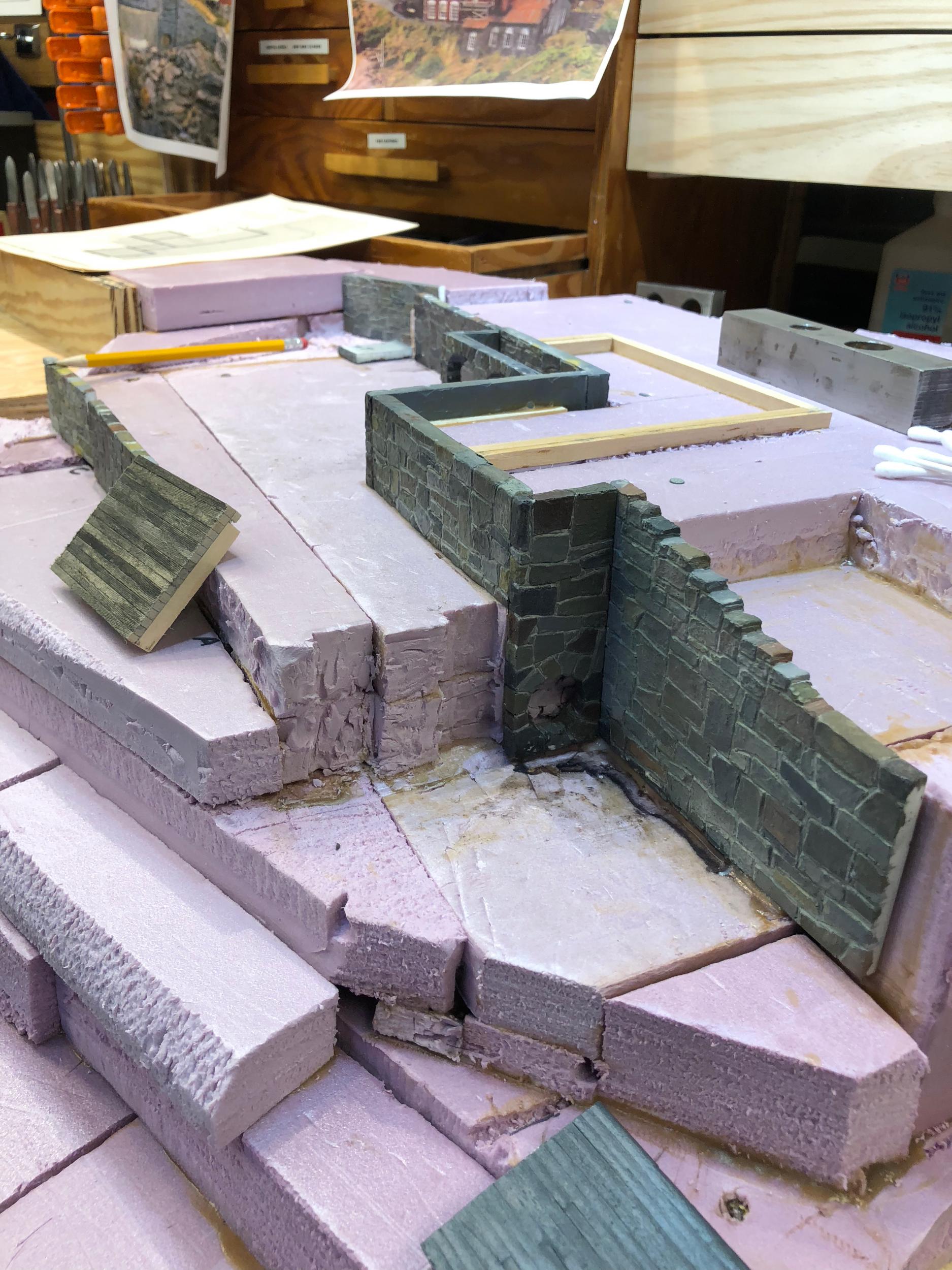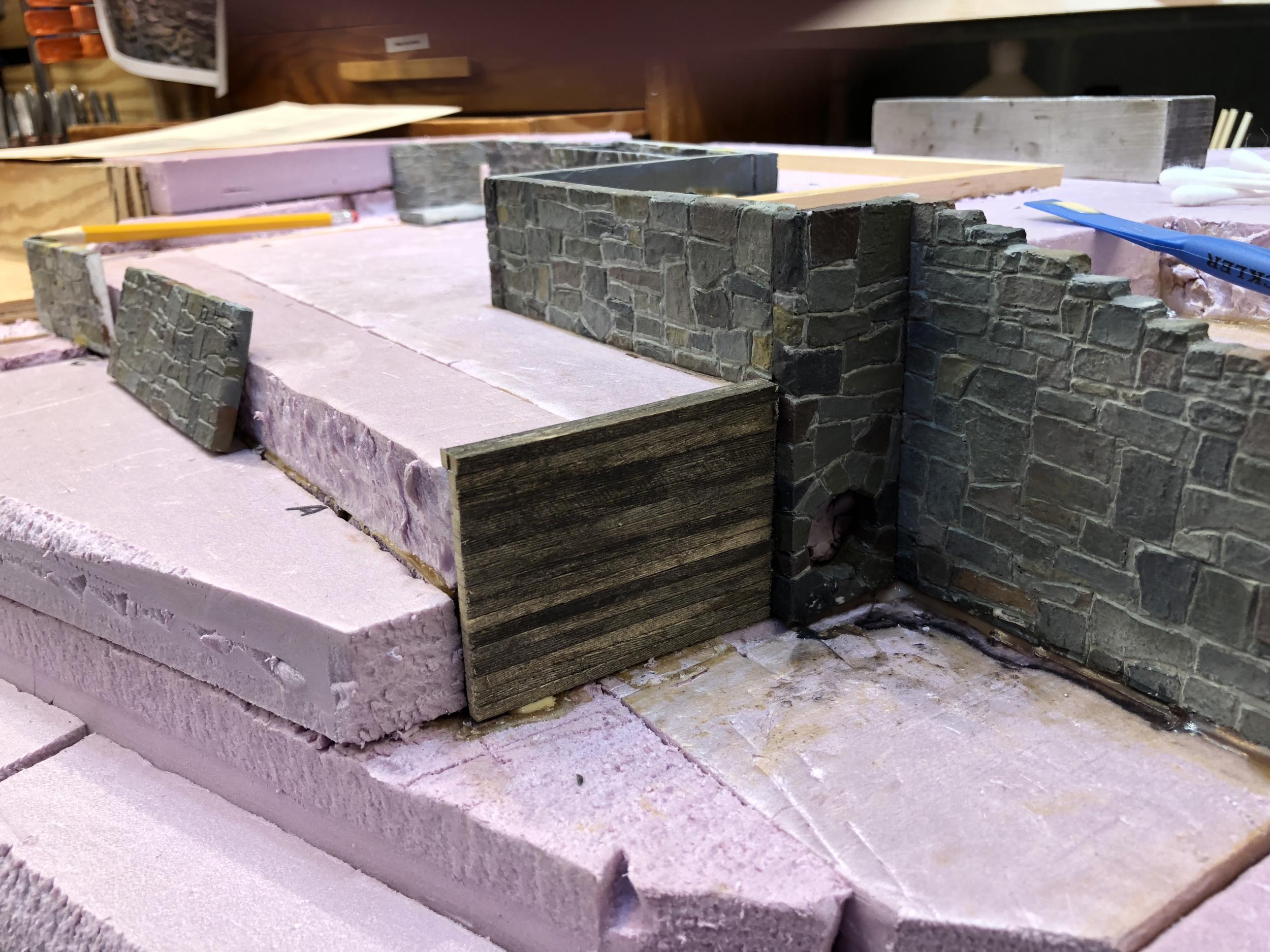 A few more progress pictures this evening:  Bob provides a plaster casting in the kit for the timber dam.  I decided to build my own out of wood. There will be some changes - sorry it's the Engineer in me. I built the timbers board on board with a hidden frame to hold them in place. I will be adding additional supports rather than just relying on the stone  foundation on each side of the timbers to support the force from the backwaters agains the timbers. The water level for the backwaters can be adjusted by adding or removing the timbers.