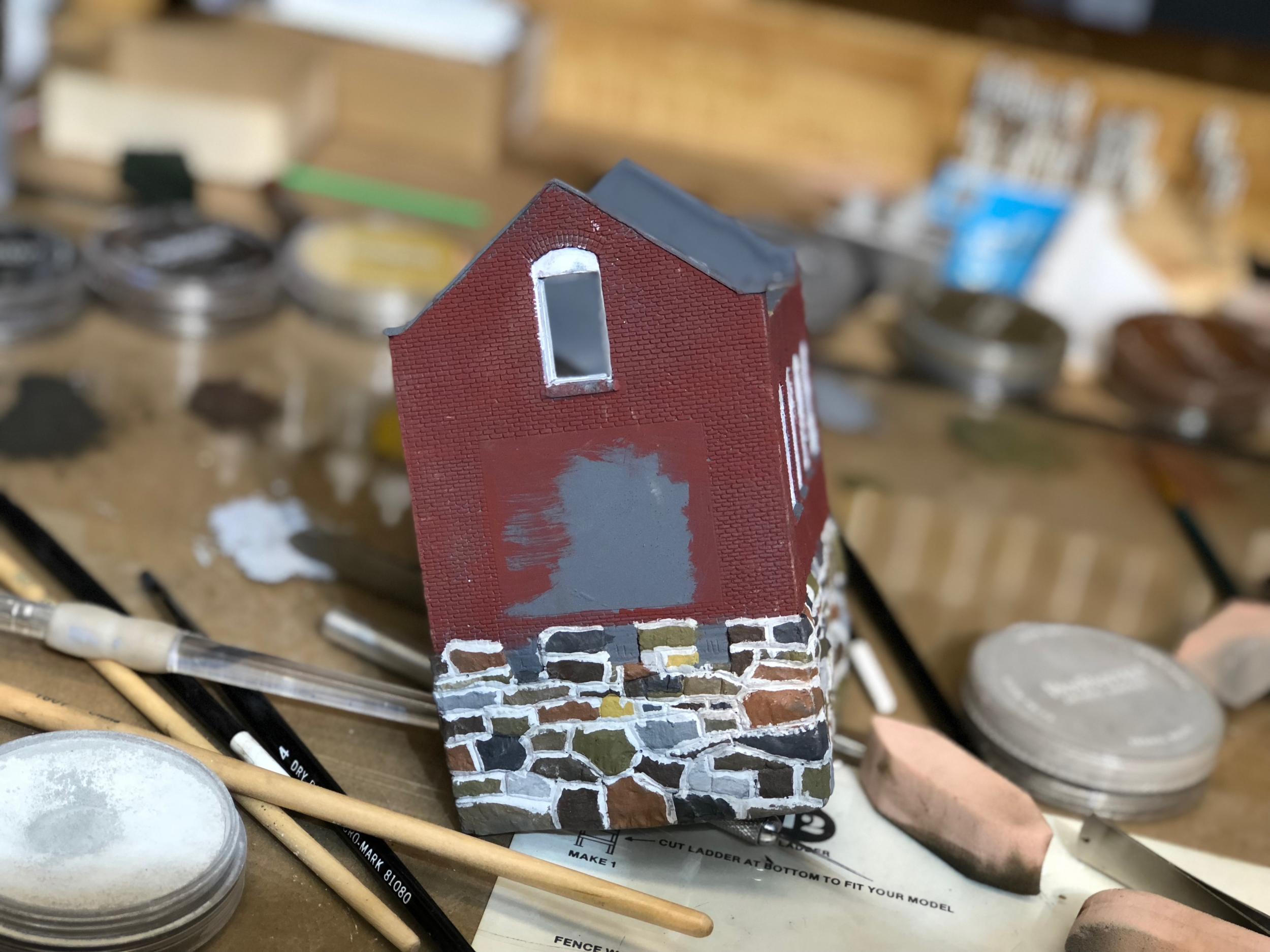 The painting process is well underway for the brick and stone side building.