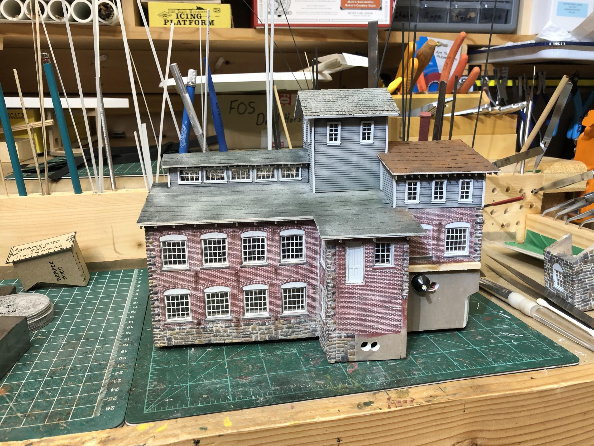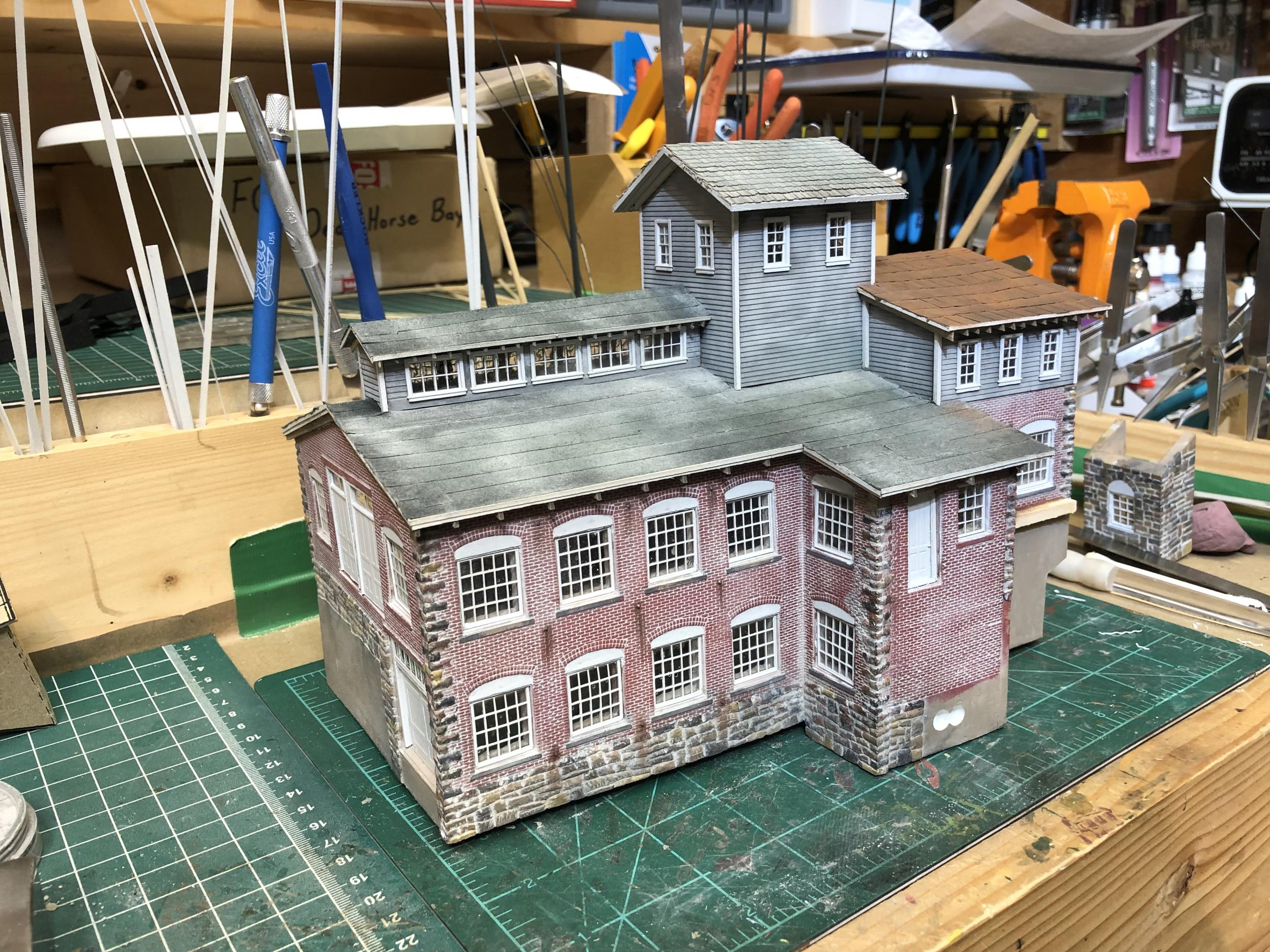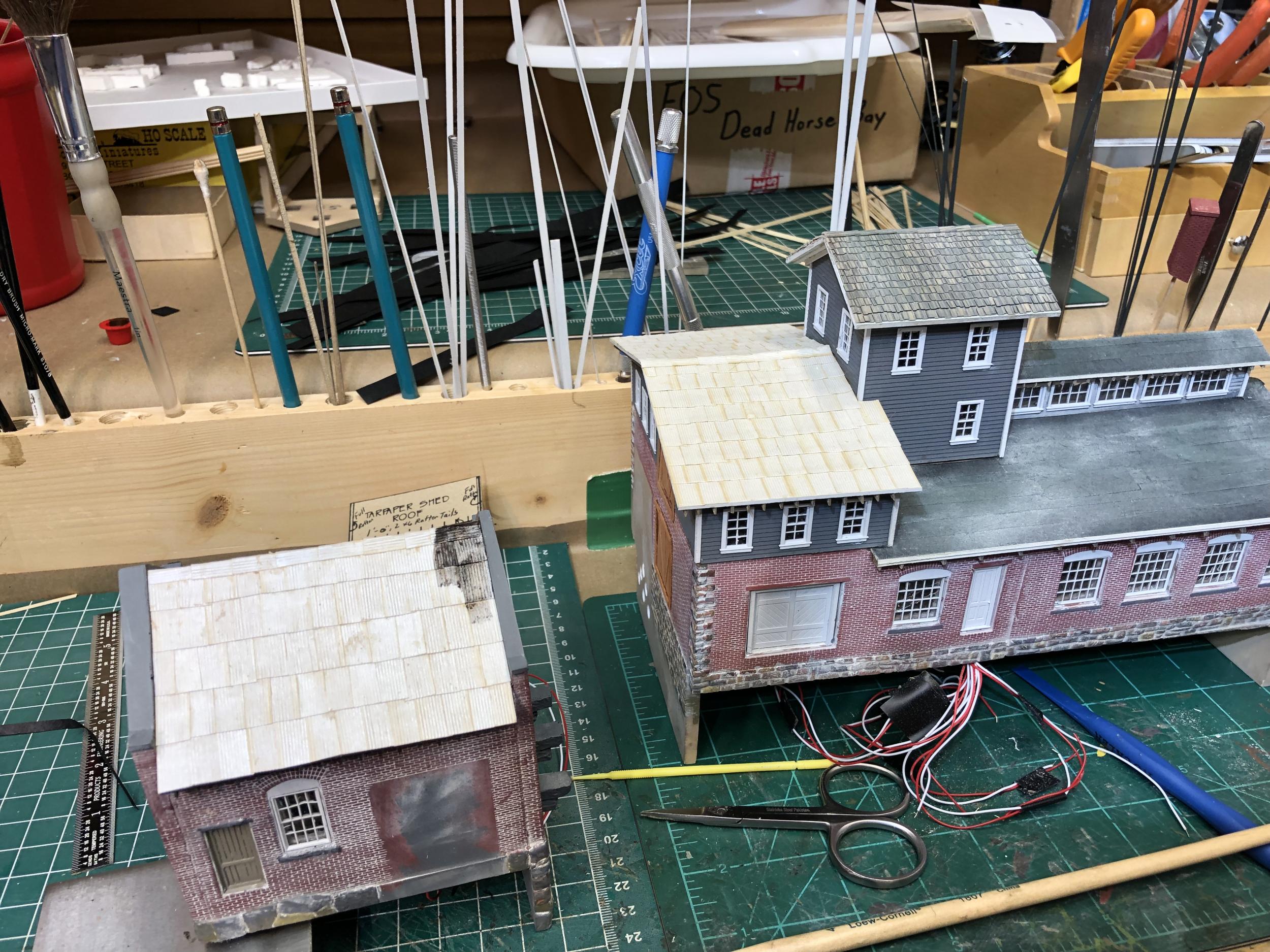 The light and dark contrast on the tarpaper is showing up much more pronounced in the photographs than it does to my eye. The iPhone cameras like to do that. ;)  I will be doing some touchup once the buildings are set in place on the diorama - and again when the diorama is placed on the layout.