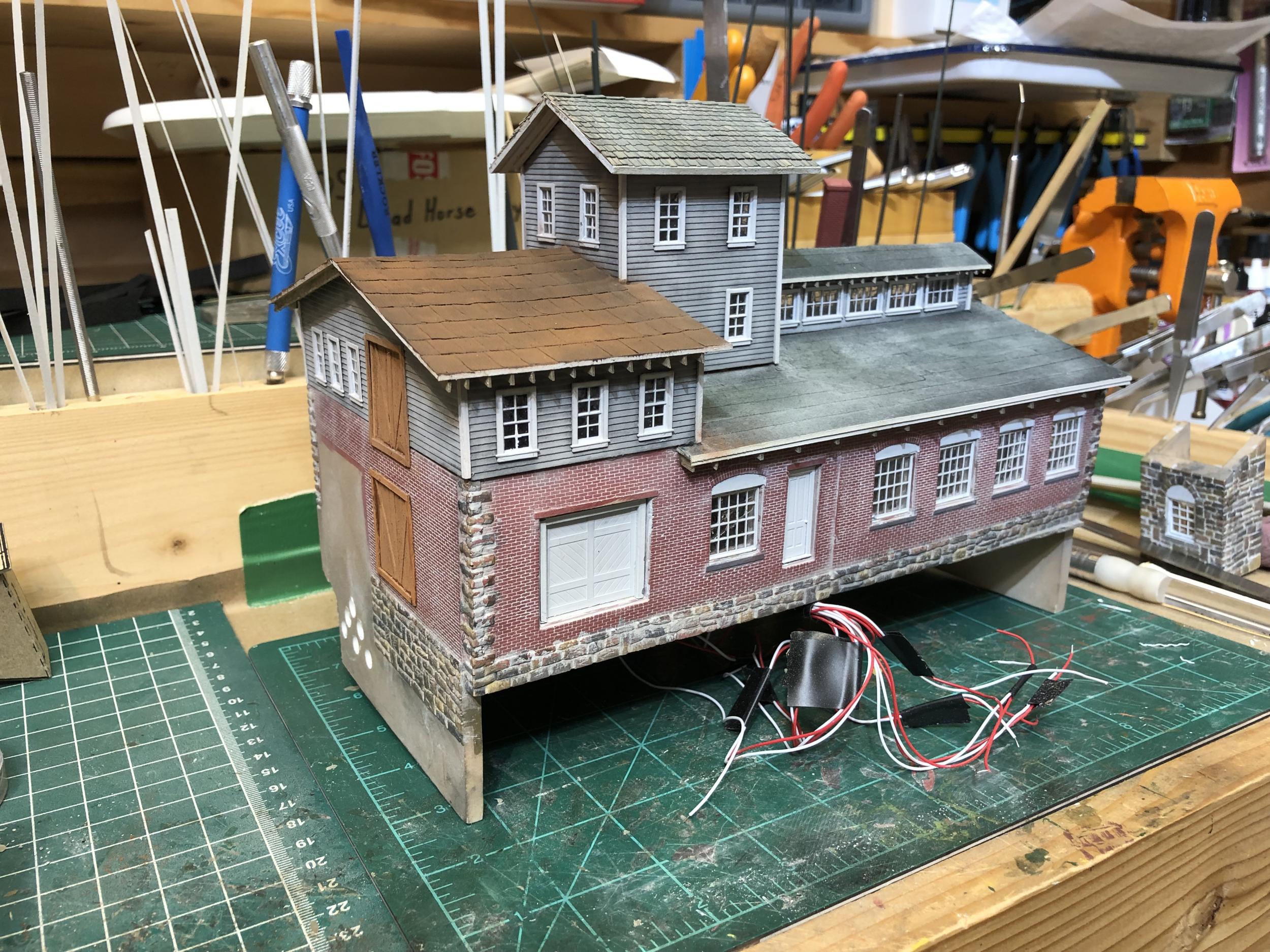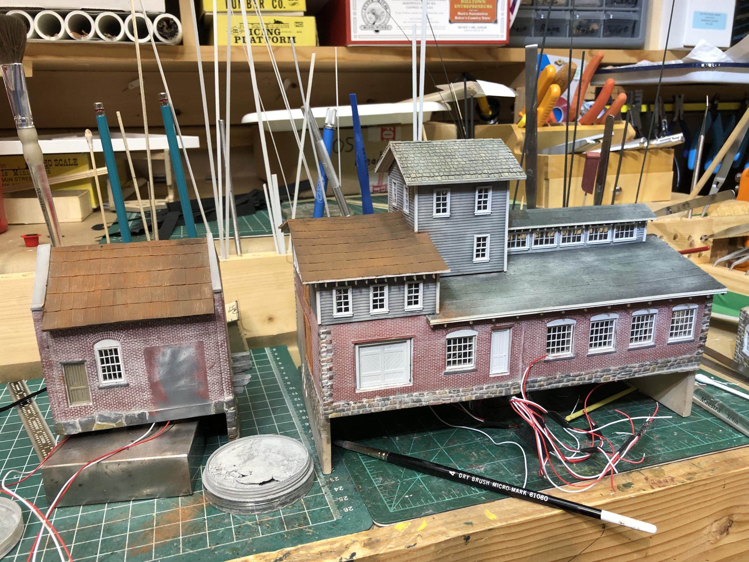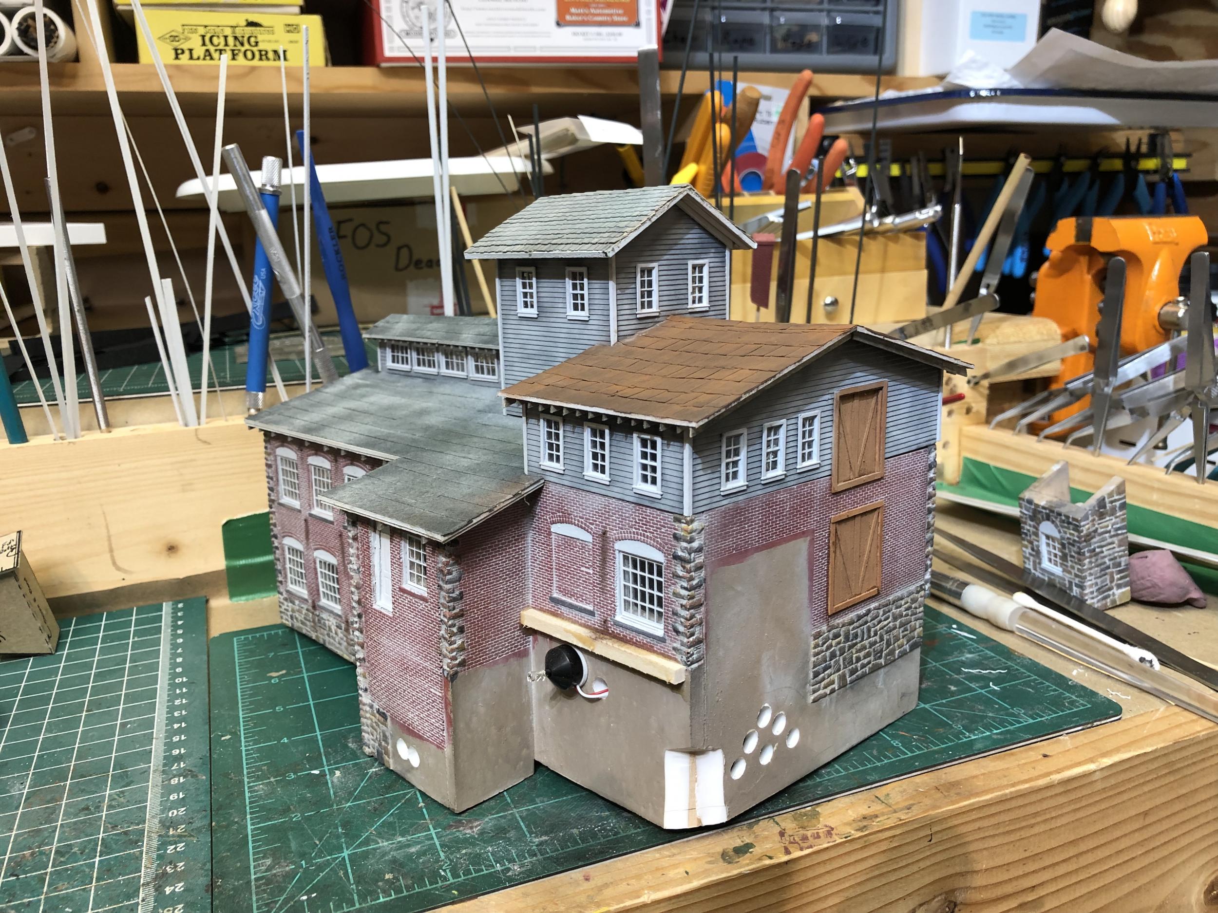 The light and dark contrast on the tarpaper is showing up much more pronounced in the photographs than it does to my eye. The iPhone cameras like to do that. ;)  I will be doing some touchup once the buildings are set in place on the diorama - and again when the diorama is placed on the layout.