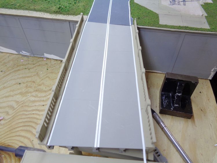 For the road striping I used Great Planes KwikStripe model striping tape. I used 1/16" (1.6). In HO it is actually about 6" wide but it still looks decent.