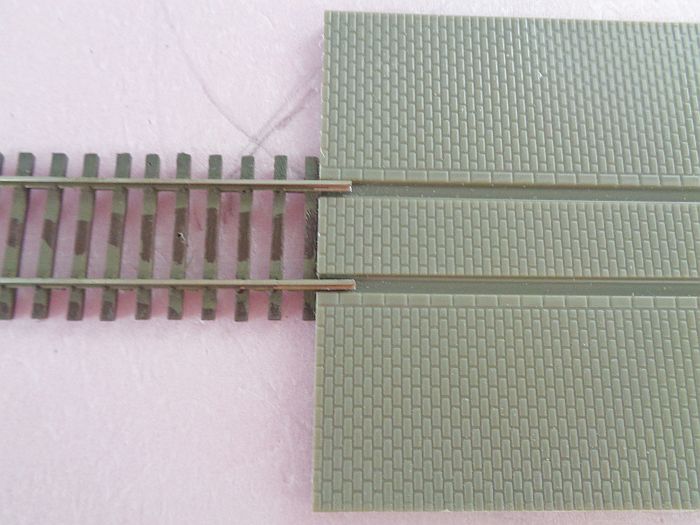 The Walthers brick street sections/sheets are made so the rails match a section of track. I use code 83 Micro Engineering flex track. The ties are the same height as the bottom of the rail pit and the brick street piece.