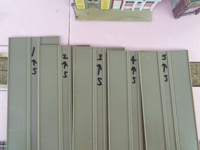 I laid the five street sections in place and end to end. I made sure I had a good fit. In order to keep them in the correct order, I numbered the sections 1-5. The arrow tells me to place this piece with the numbered end facing south.